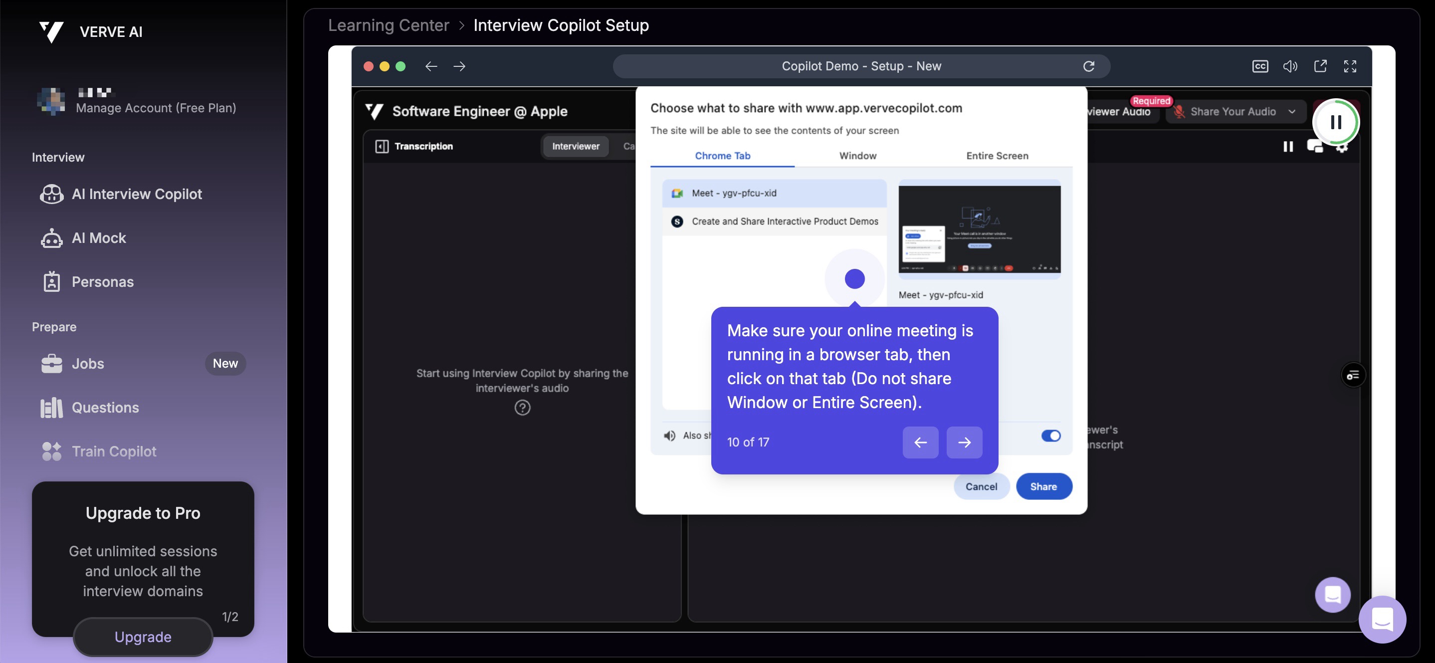 Verve AI relies on the assumption that the interviewer will not request screen sharing. First, its core features can only be used via the Google extension. The extension must be pinned in the browser toolbar, and during the interview, I have to click the extension to generate AI answers, which the interviewer can definitely see. Second, Verve AI even explicitly warns in its tutorial not to select “Share Window” or “Share Entire Screen” during an online meeting.
