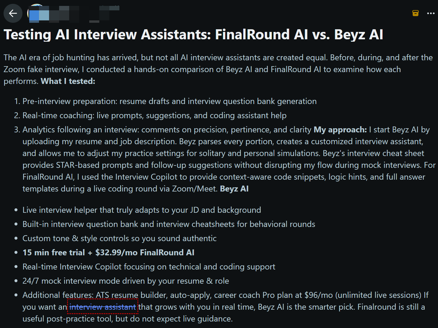 In the article, I learned that Beyz AI helps with behavioral and technical prep but cannot provide real-time support during interviews. To dig deeper, I started testing that and wrote this Beyz AI review afterwards.