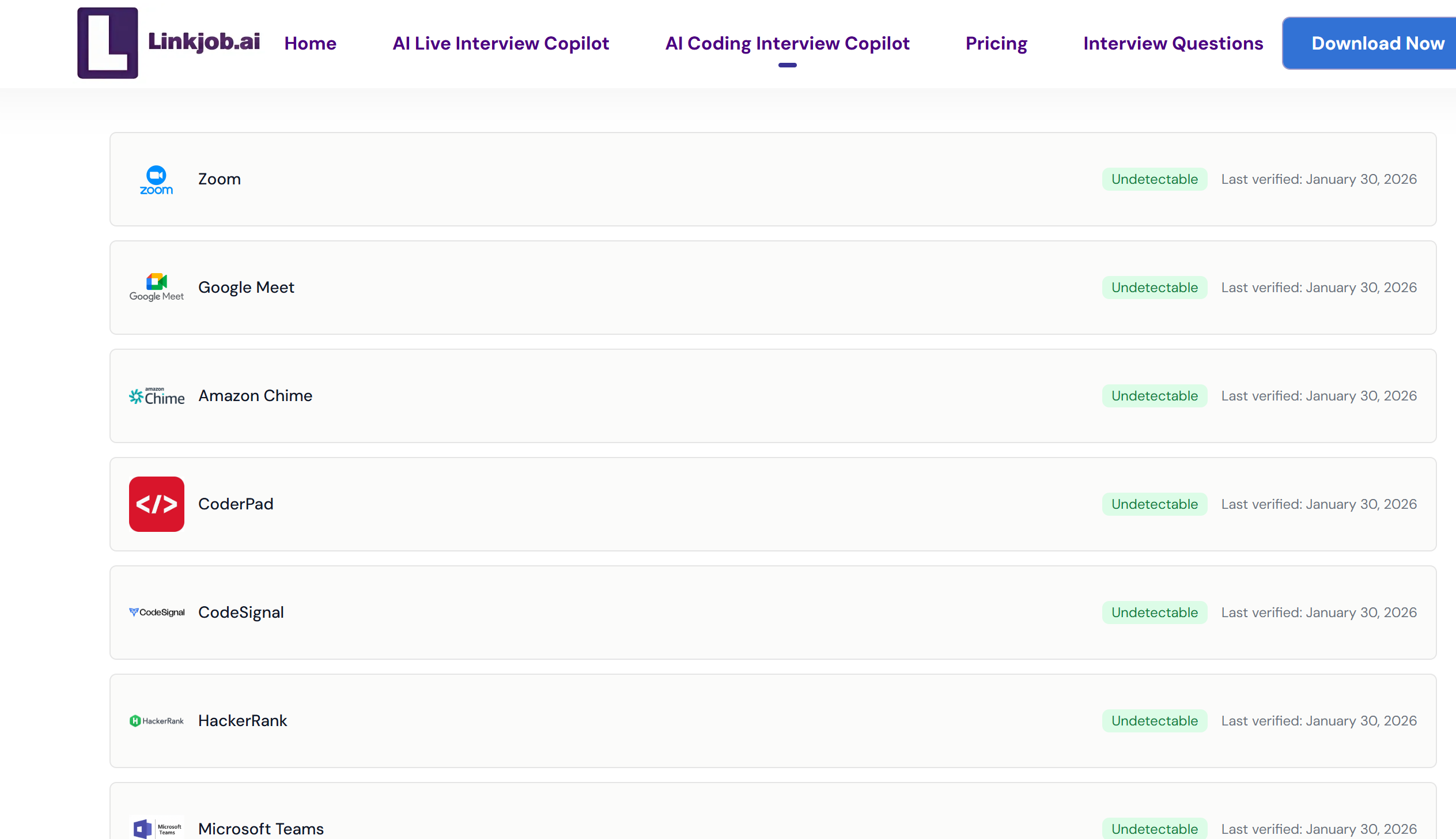Alongside features I mentioned above, including 100% invisiblity, 129 AI models available, and the principles explained, Linkjob AI also works with any interview platforms, including Zoom, Teams, Google Meet, CoderPad, CoderSignal, and HackerRank.