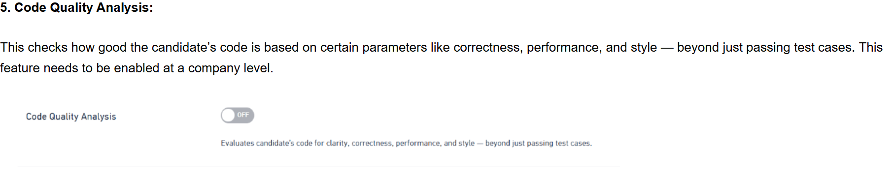 Plagiarism detection: This feature is specially designed for technical assessments. It compares code against global code repositories and historical data to find highly similar code.