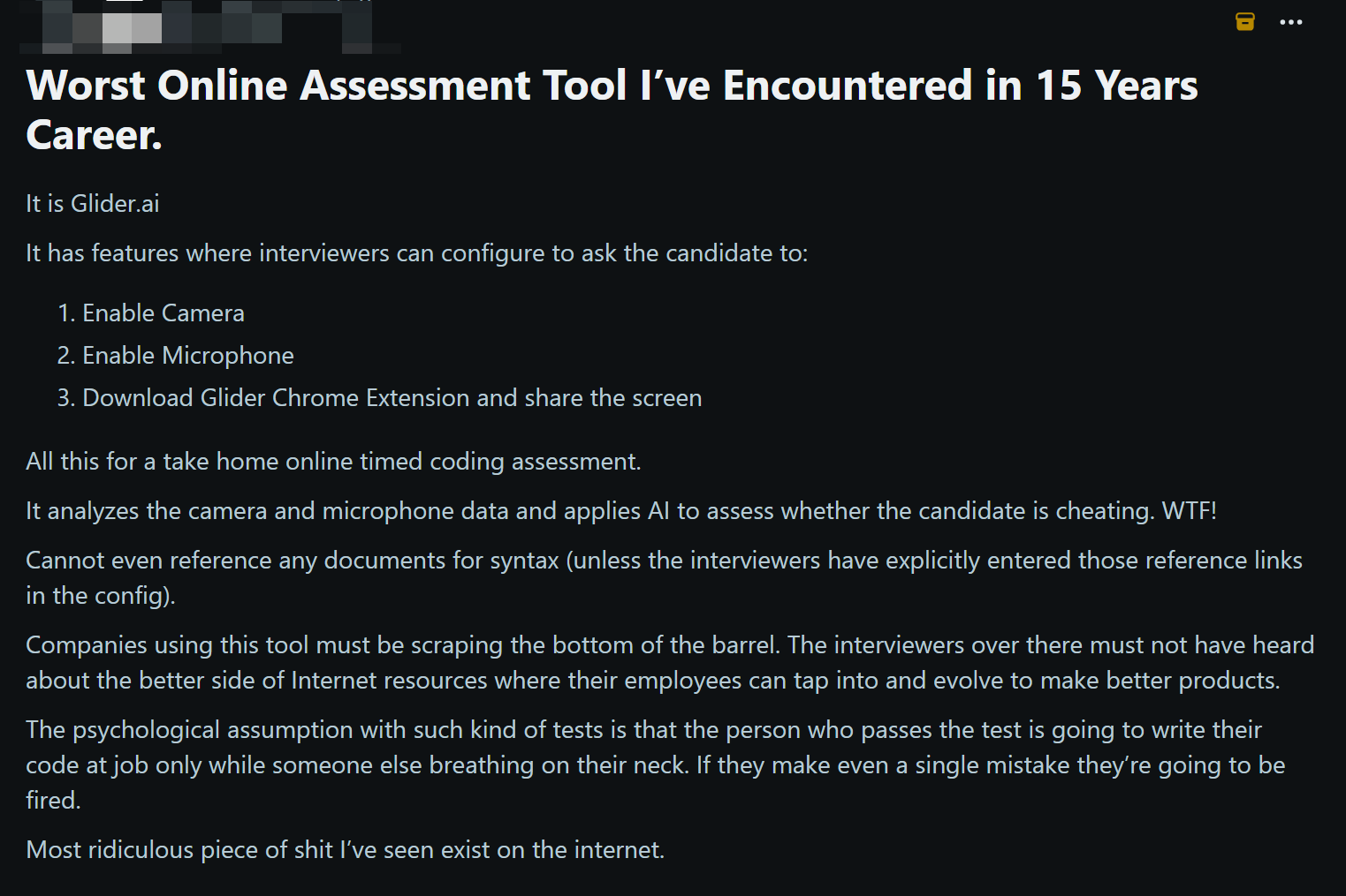 People actually tried Glider AI's assessments four or five years ago. At the time, there weren't many platforms offering AI-based assessments, so it got pretty much slammed by the critics. I recently took a Glider AI test myself and, with its AI proctoring enabled, managed to pass easily using Linkjob AI, a real-time AI interview assistant.