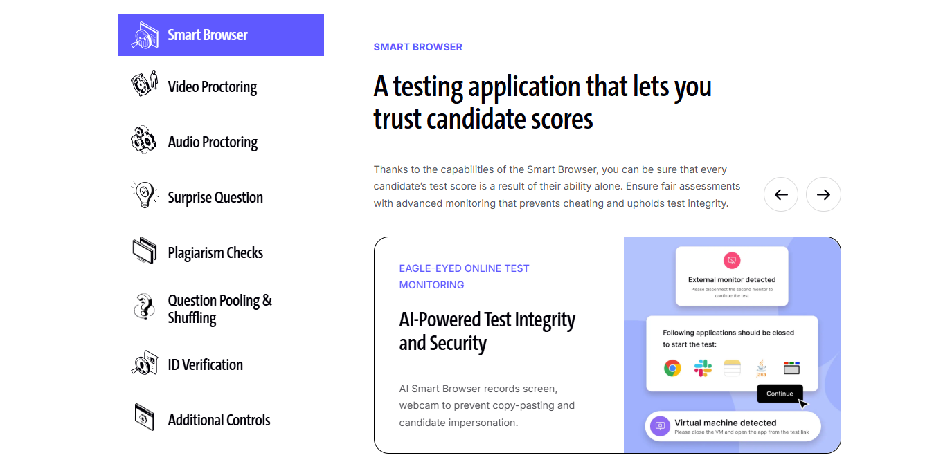 Application lockdown: Prevents opening other apps, browser tabs, or external links during the test.
