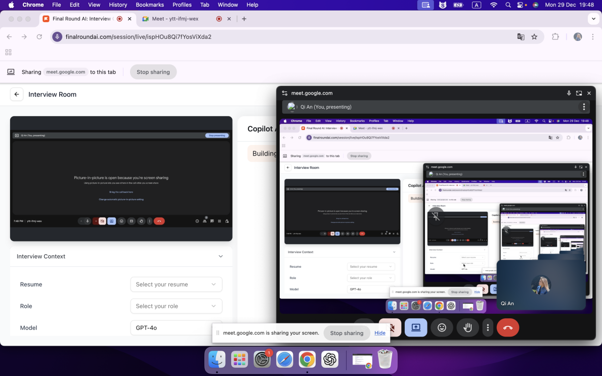 Thanks to the AI assistant’s ability to capture screen shots in real time and simultaneously interpret the interviewer’s verbal instructions, I have completely eliminated my reliance on mobile communication or assistance from outside the room, making this process extremely discreet. This integrated approach allows me to keep my eyes fixed on the monitor at all times, maintaining natural eye contact while avoiding the risk of the camera capturing unwanted figures in the background.