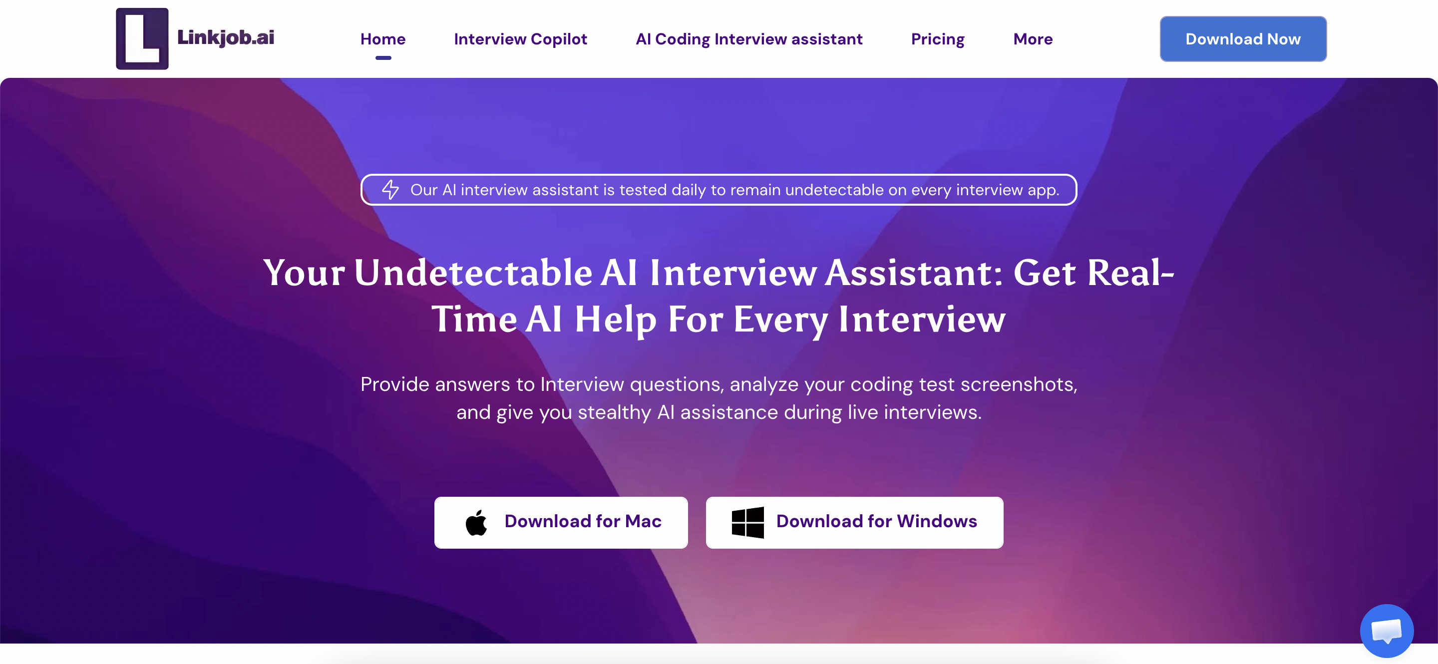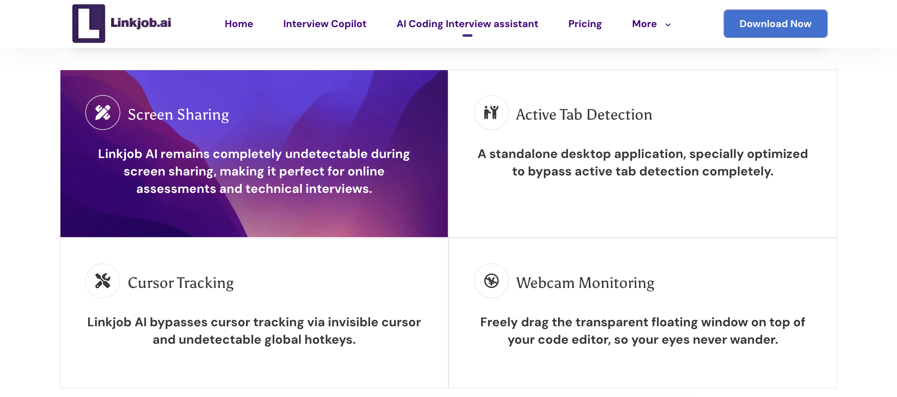 As a desktop AI interview assistant, Linkjob is virtually undetectable in any scenario. Whether it’s a standard interview or a coding interview, and whether you’re sharing a single window or your entire screen, it remains completely invisible in every situation.