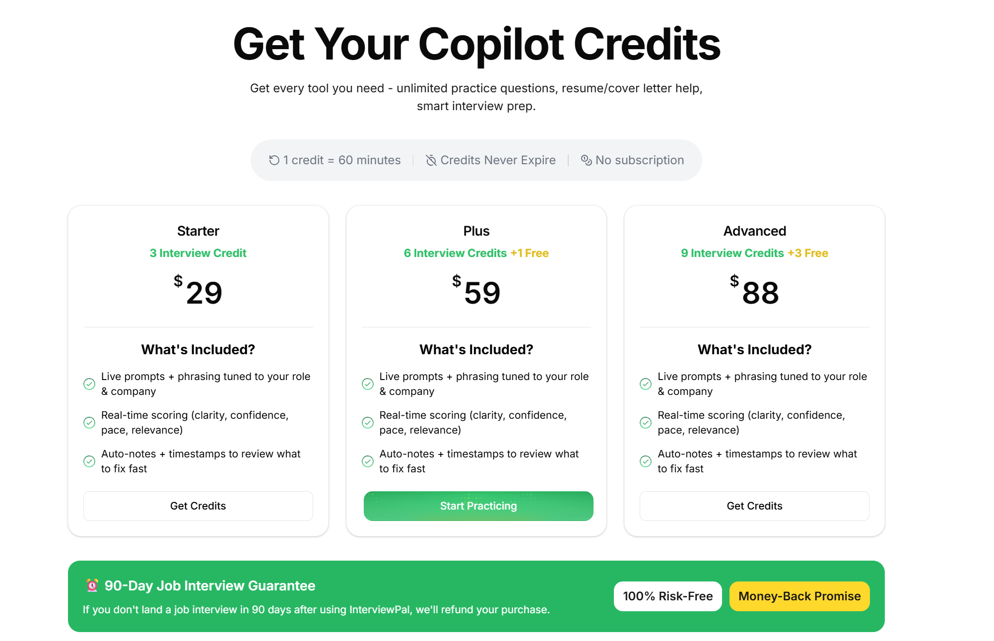 InterviewPal only offers subscription plans based on credits. Honestly, it's quite affordable, but I wouldn't pay for it. First, each session has a time limit. If my behavioral interview runs long, I can't hang up and resume after resubscribing. Second, InterviewPal only supports behavioral interviews and isn't particularly user-friendly. Had I seen the reviews on Reddit before subscribing, I definitely wouldn't have paid.