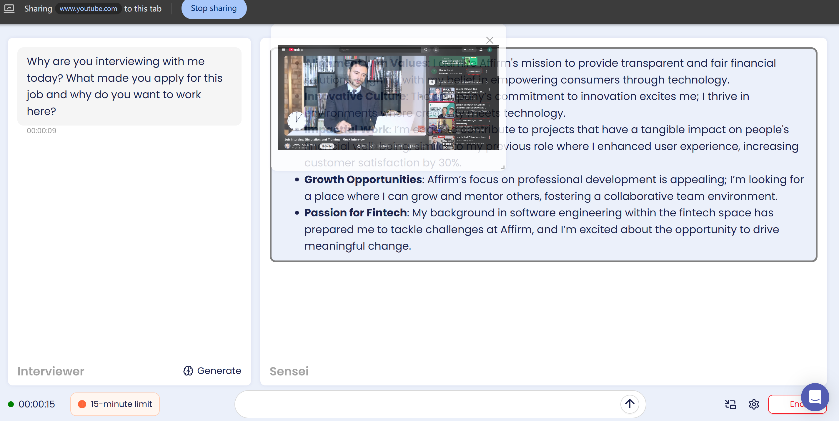 Sensei AI works well for practice and mock interviews, but its browser extension, which requires you to share a tab page instead of full screen, can appear during a live interview, and red-flag this interview as cheating, since more and more companies have adapted active tab checks.