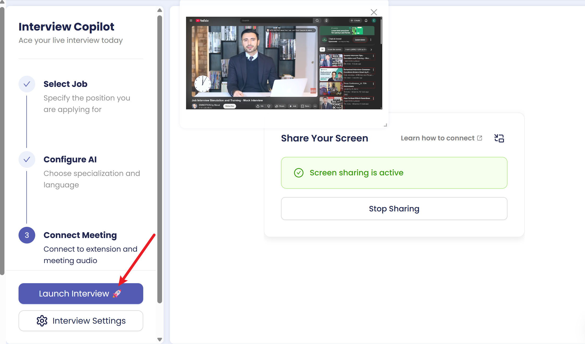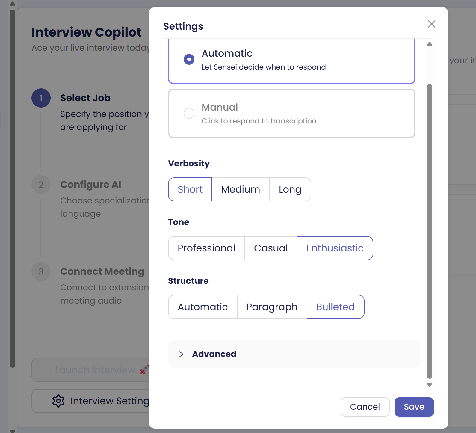 Like most AI interview assistants, when I first went into the Sensei AI trial interface, I was asked to: