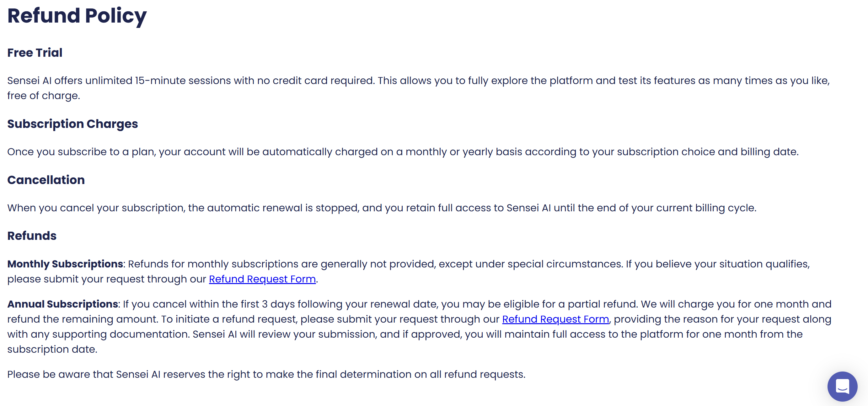 It is obvious that if I purchased Sensei AI for a month, and felt unsatisfied the first day I used it, it is possible that I can't get my money back, unless it's under special circumstances.