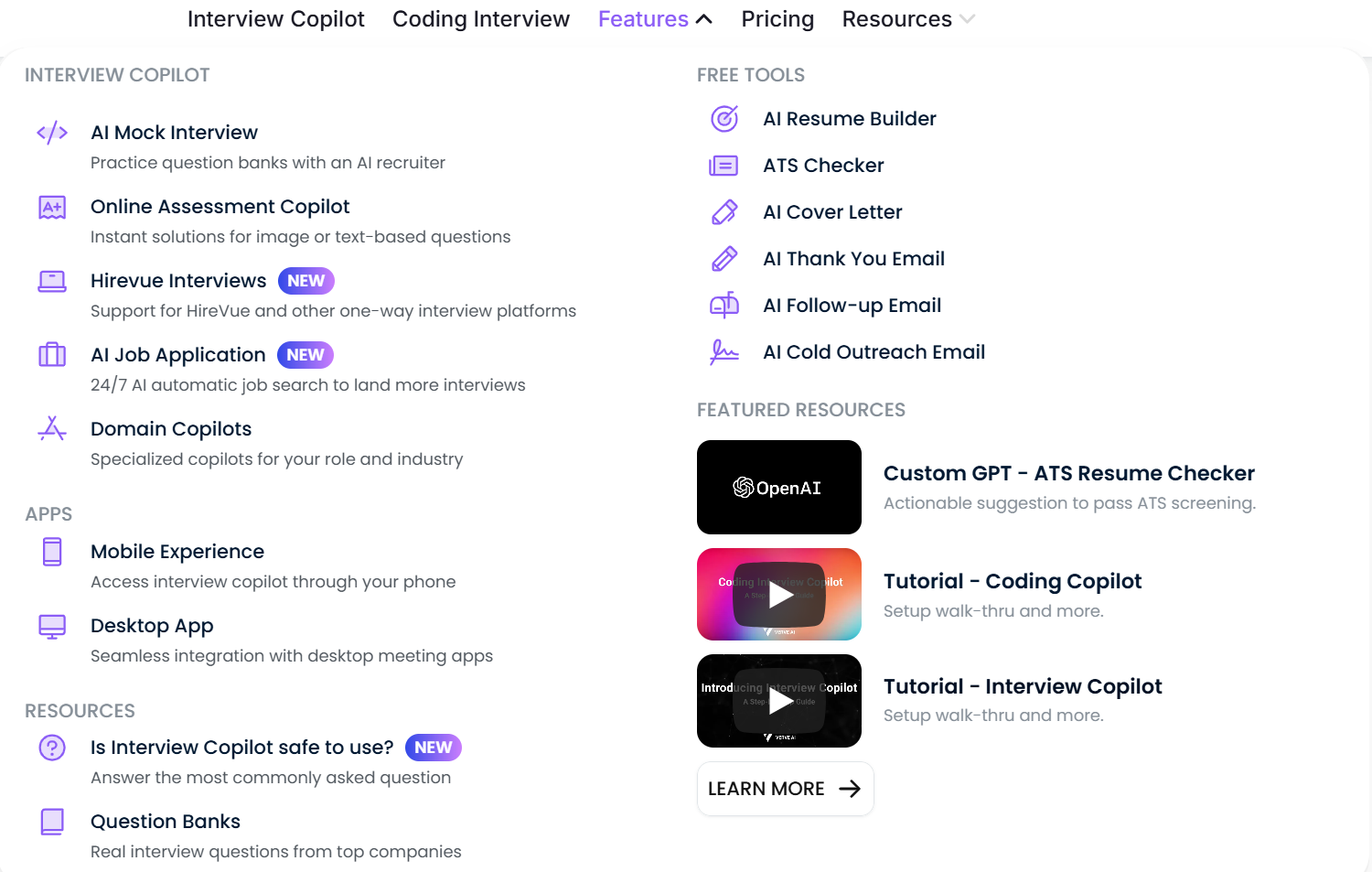 Specialized Copilots | Dedicated modes for behavioral and coding interviews. |