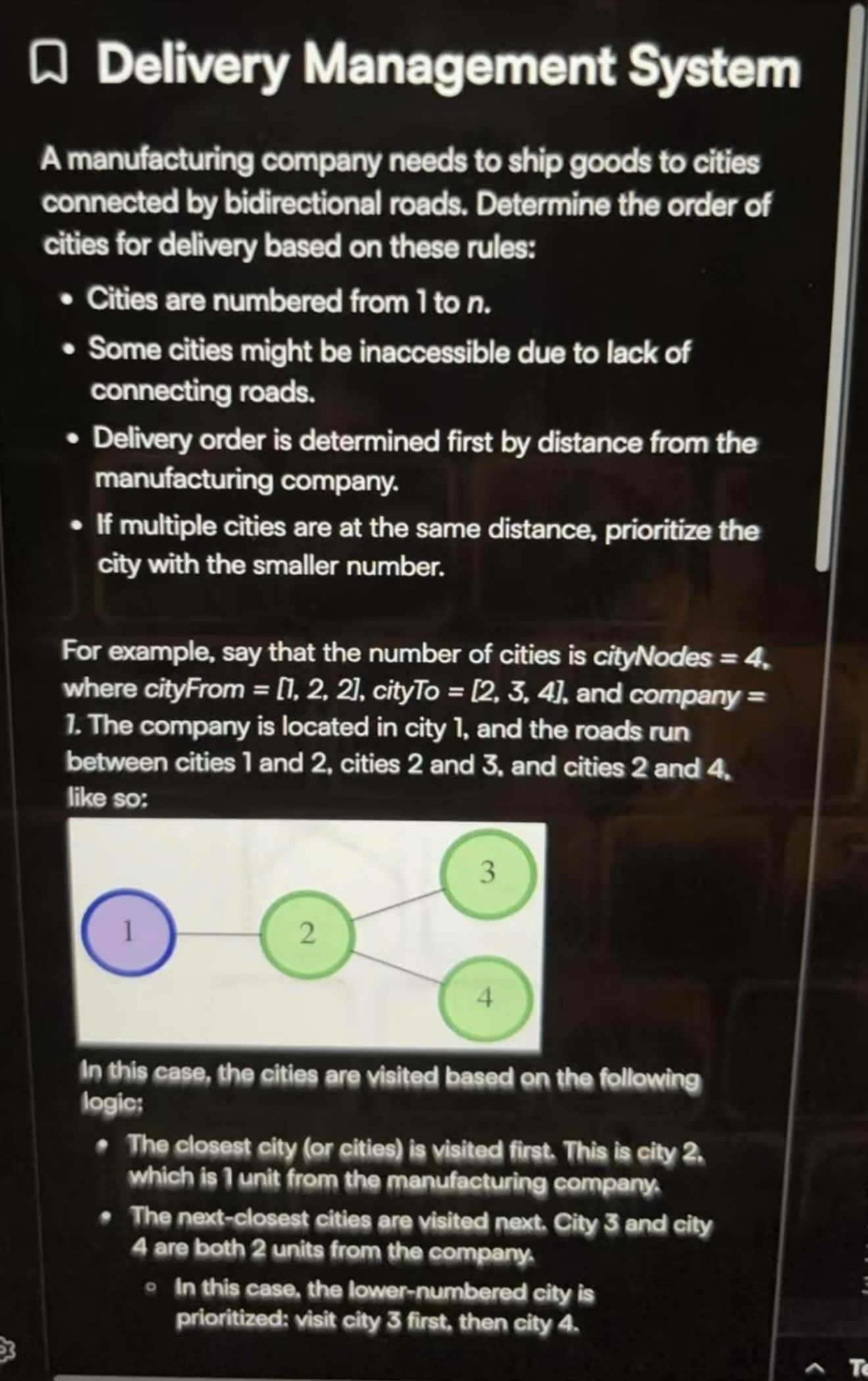 Second question mainly tested BFS. I started by building a graph: an undirected graph of cities and roads, stored as an adjacency list. I performed BFS starting from the city where the company is located to ensure visiting cities from near to far. For each layer of cities, I sorted them in ascending order of their numbers before adding them to the result. This ensured that when distances were the same, the city with the smaller number was prioritized. Finally, I returned the city numbers layer by layer.