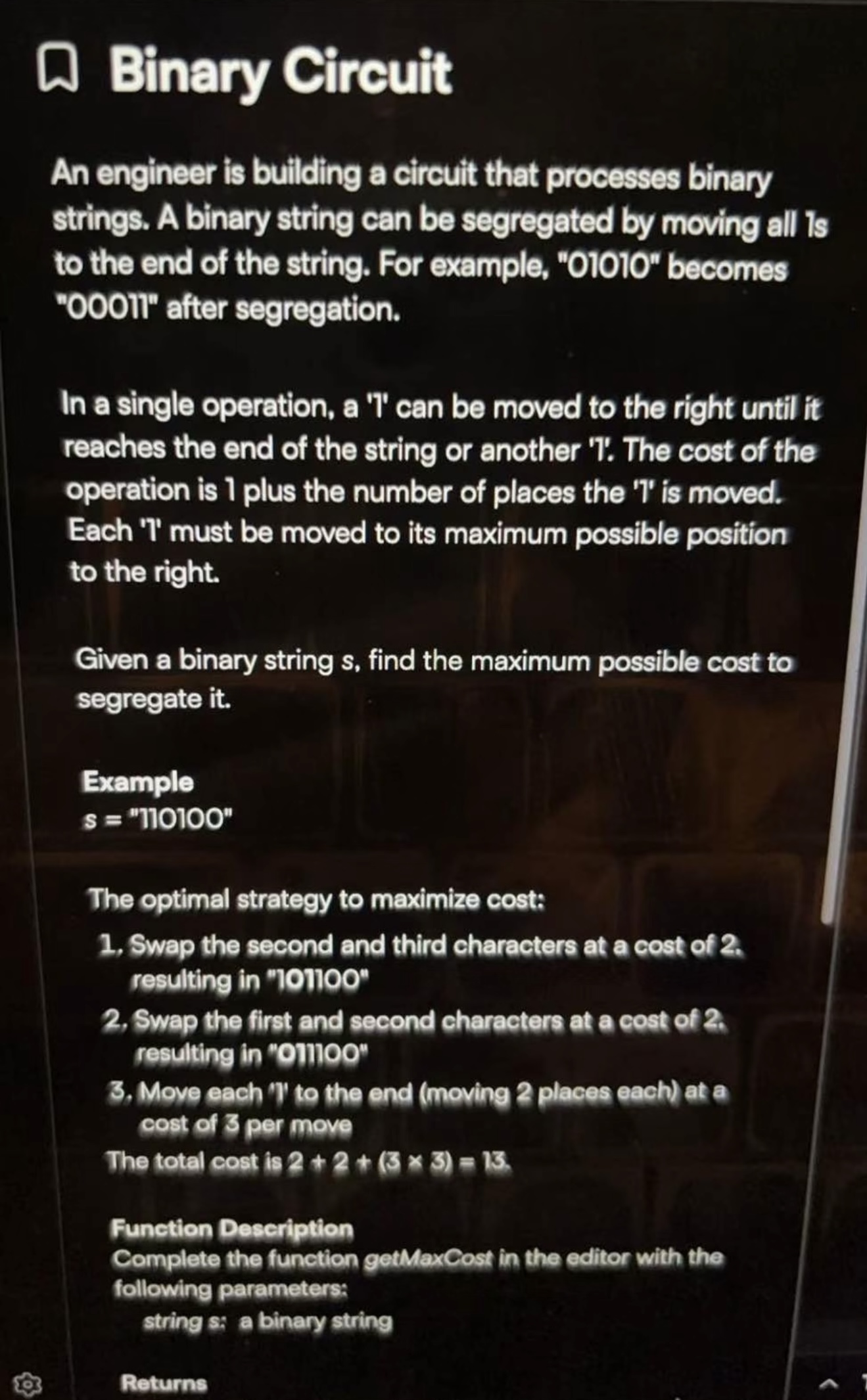 Third question mainly tested how to calculate contributions. I first divided consecutive 0s into segments. Each segment of 0s would be crossed by all the 1s on the left once, because each 1 needs to move to the rightmost possible position. Crossing a segment of 0s of length z counts as one operation, costing z + 1. If there are ones number of 1s to the left of a 0 segment, the total cost is ones × (z + 1). Summing the costs of all 0 segments gave me the maximum total cost.
