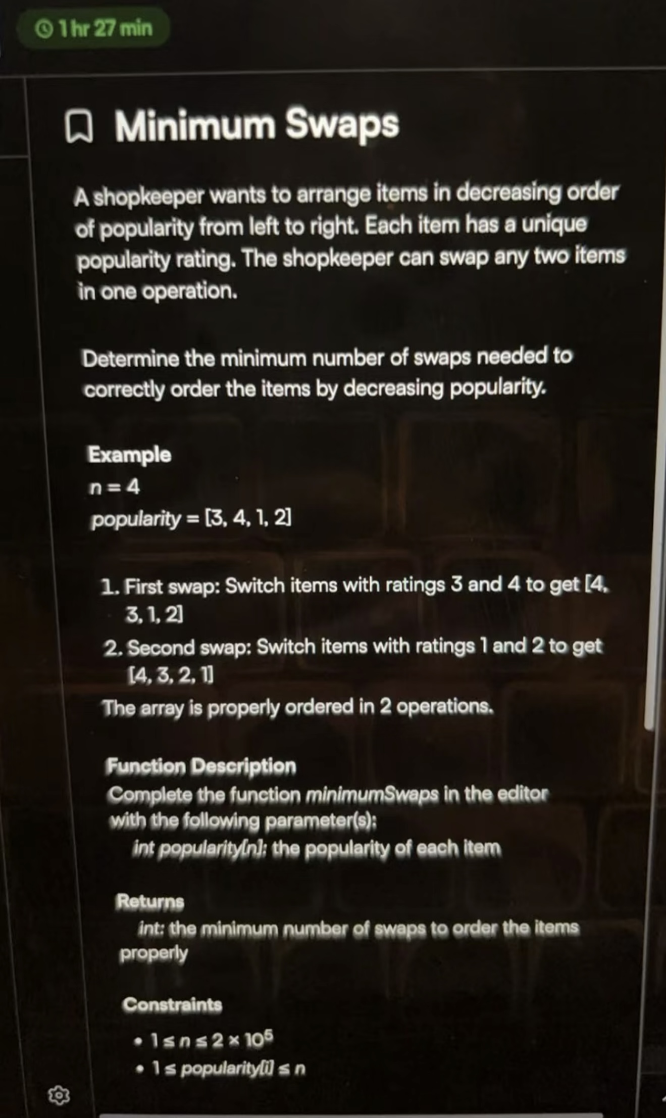 First question mainly tested my ability to transform a problem. I first sorted the array in descending order and then transformed the problem into finding the minimum number of swaps needed to sort it. I bound each element to its original index. After sorting the values in descending order to determine the target positions, I traversed the array to find the size of each cycle. The number of swaps for a cycle is the cycle length minus 1. Summing these values gave me the final result.
