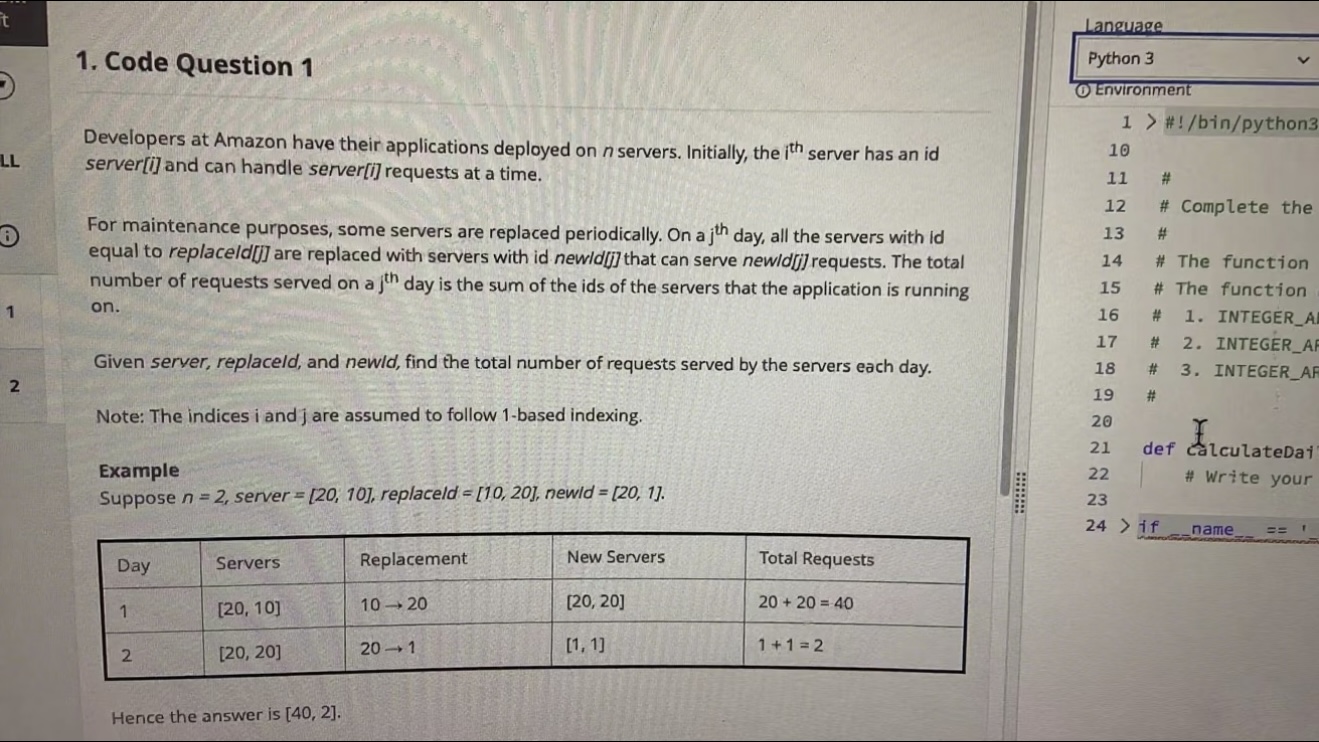 In Amazon’s online assessment, there were two coding questions with a 70-minute time limit and a difficulty level between medium and hard. I hadn’t practiced enough questions before the test, so I didn’t pass all the test cases. Still, I wanted to share my experience.