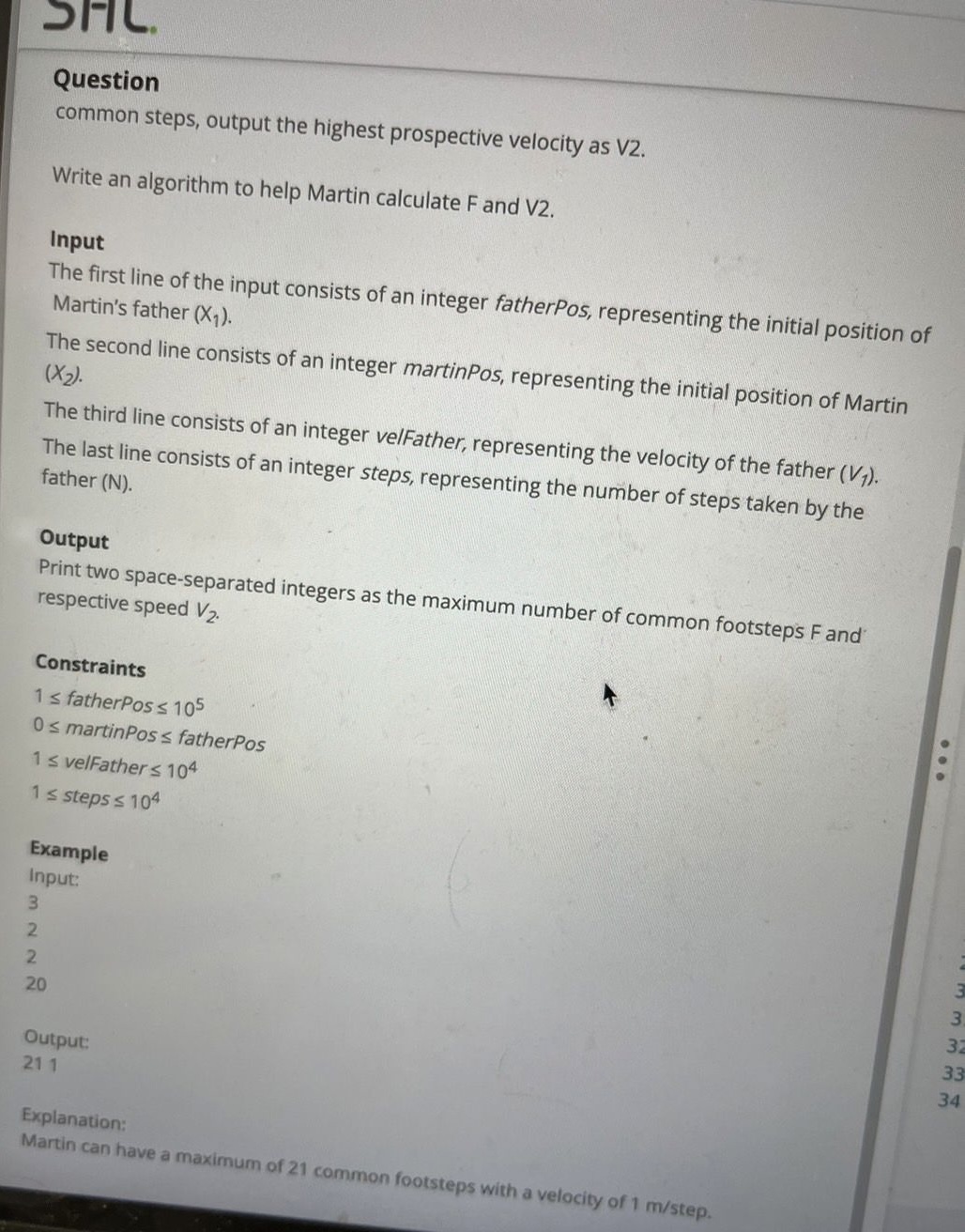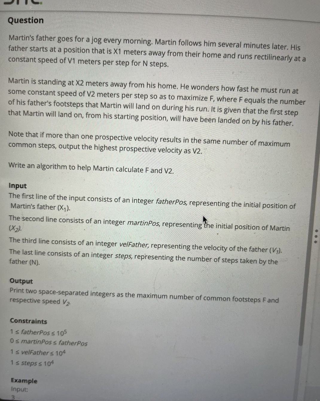 Next, we analyze Martin’s situation. His starting position is martinPos, and we need to find the velocity V2 that maximizes the number of overlapping positions F between Martin’s steps (martinPos + j * V2, where j starts from 1) and father_steps.