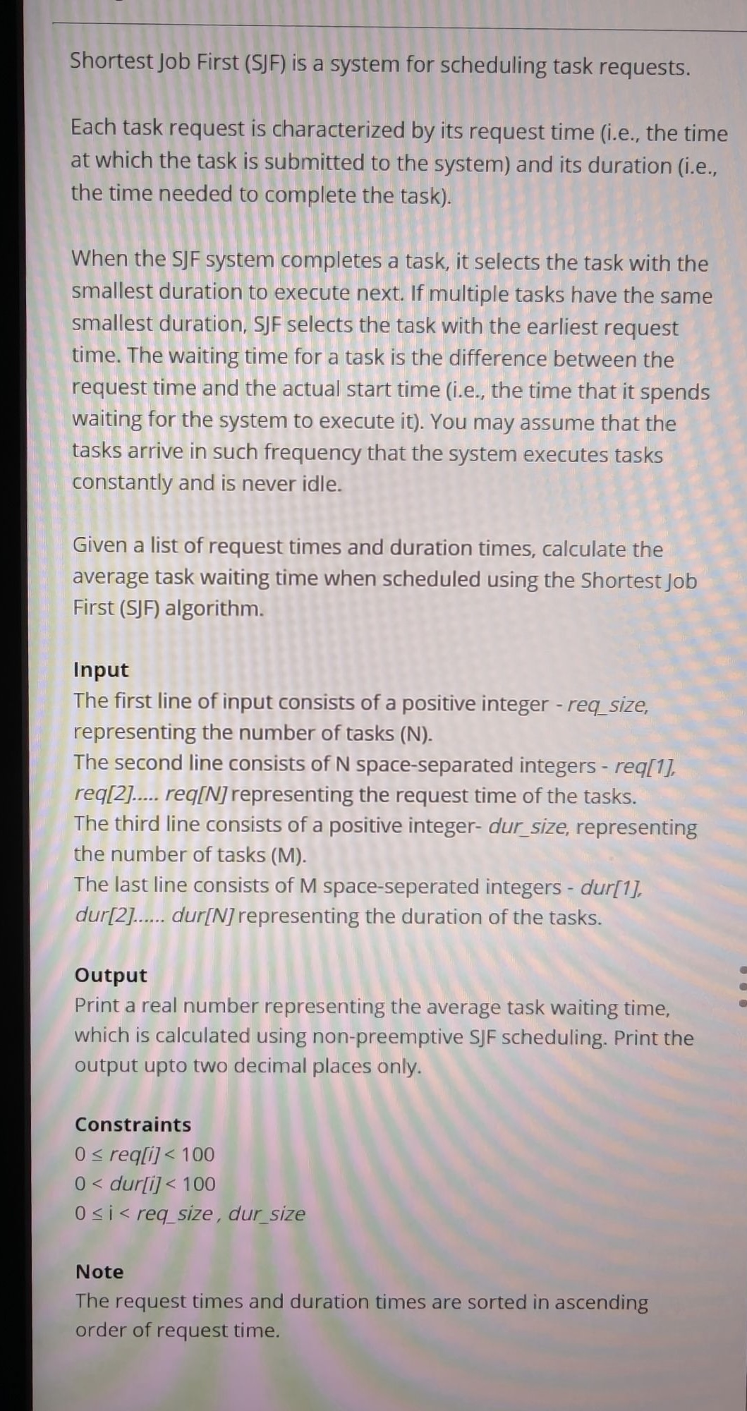 Compute the waiting time for that task (current_time - request_time), then update current_time to the task’s completion time (current_time + duration). Repeat this process until all tasks are completed. Finally, sum up all waiting times and divide by the number of tasks to obtain the average waiting time, rounded to two decimal places.