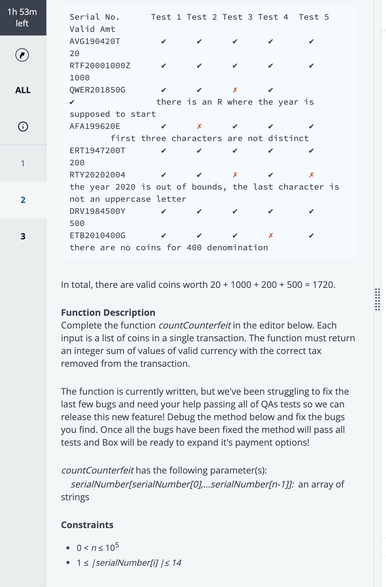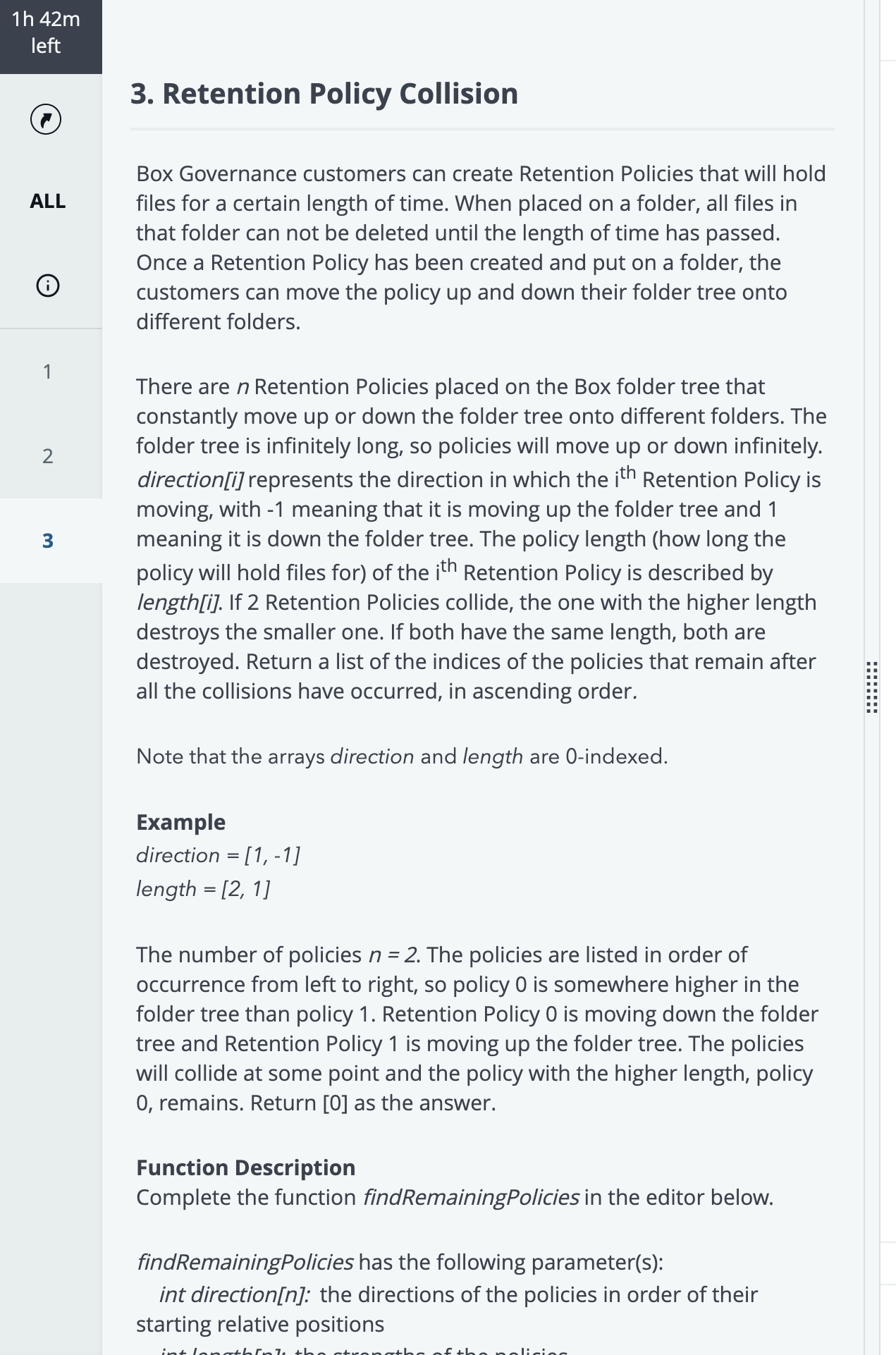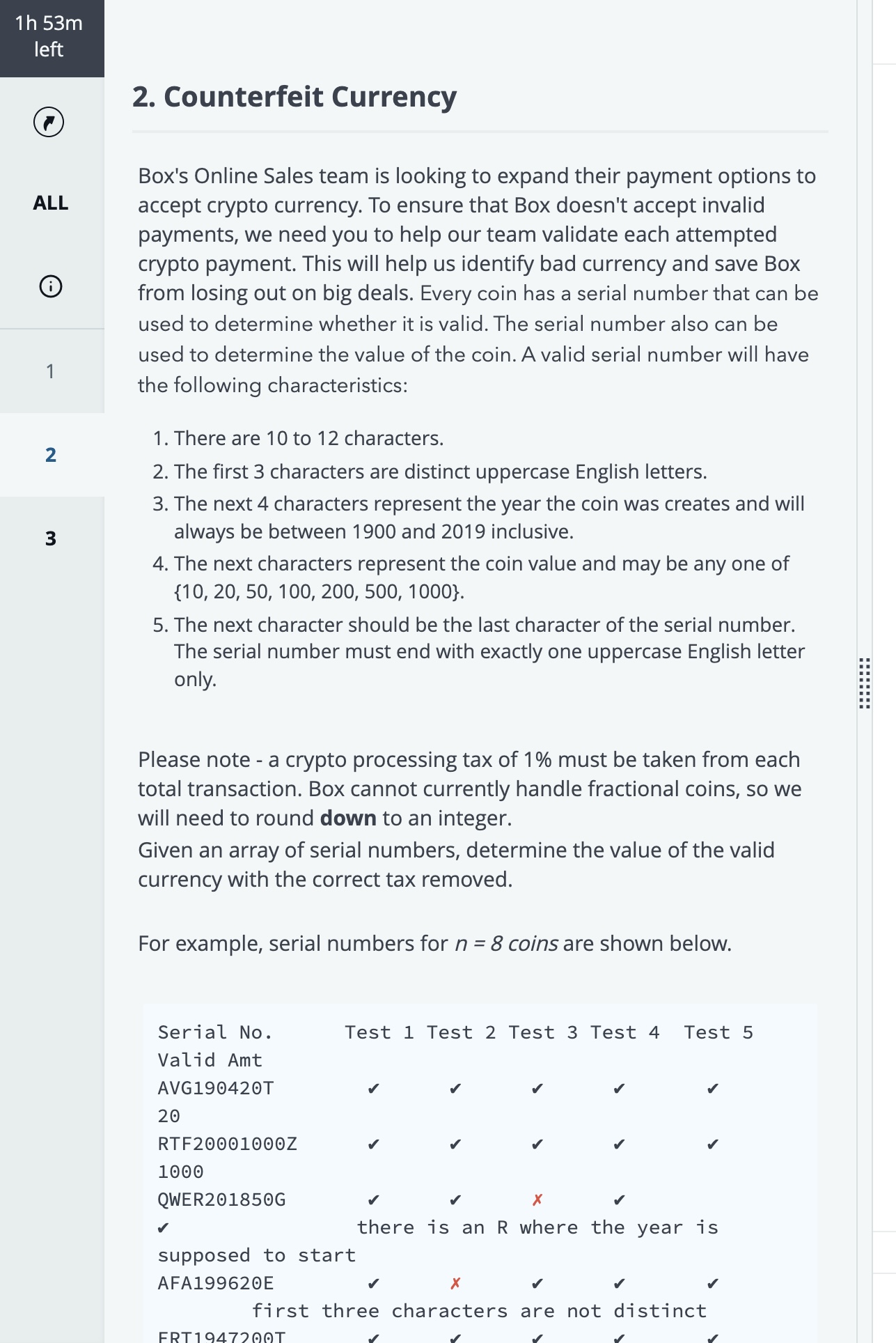 The Box SWE HackerRank OA consists of three questions with a 120-minute time limit. Overall, the three problems in this OA covered Array/String Manipulation, Validation and Calculation, and a problem involving Simulation and Data Structures. I would rate their difficulty as follows: Box Froyo (Problem 1): Easy Counterfeit Currency (Problem 2): Medium Retention Policy Collision (Problem 3): Hard