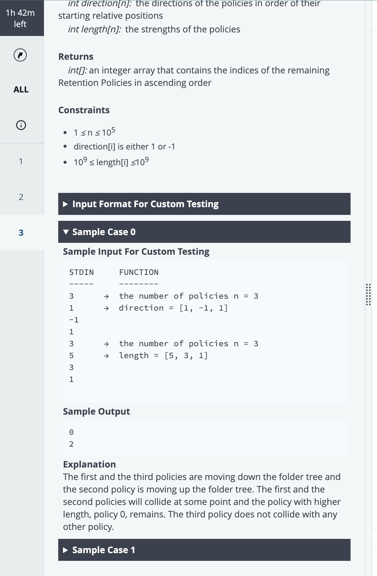 This is a challenging problem that simulates a physical collision process, but in a linear space (imagine a 1D coordinate axis, the "folder tree"). I need to process n retention policies, each with a direction (direction) and a strength (length). The policies move at different speeds and directions. When they meet (collide), they follow these rules: