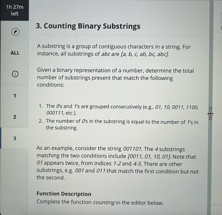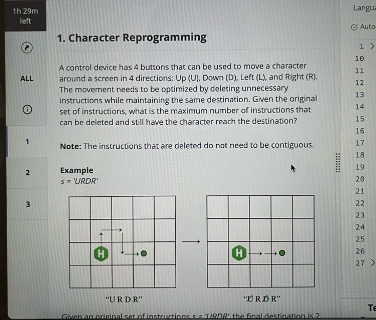 I recently completed Canva’s SDE interview. It gave me 90 minutes to solve three problems, and the overall difficulty was fairly moderate. The assessment covered three areas: counting redundant directional commands, matching positions after sorting an array, and counting substrings formed by consecutive segments in a binary string.