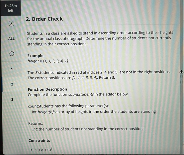 My first thought was that the correct order should simply be the heights sorted in ascending order. So I copied the original array, sorted the copy, and treated the sorted version as the correct lineup.