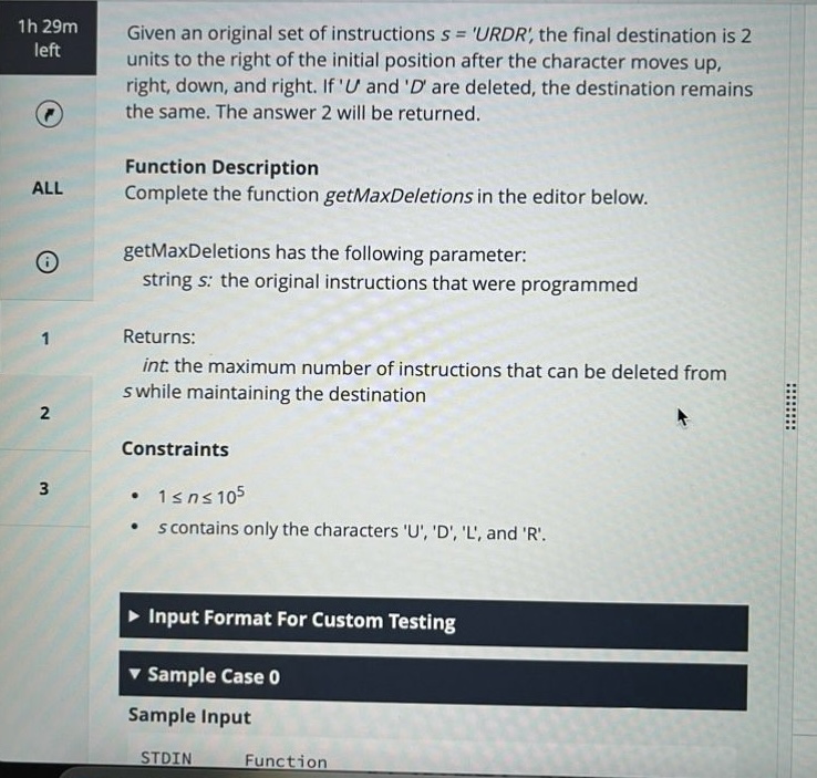 Time Management: I set aside 40-45 mins total including checks and allocated time evenly. Initially, I spent 10-12 mins per question. String and array-based questions had clear logic, so I put most of that time into coding and basic test case verification, making sure each step matched the problem requirements.