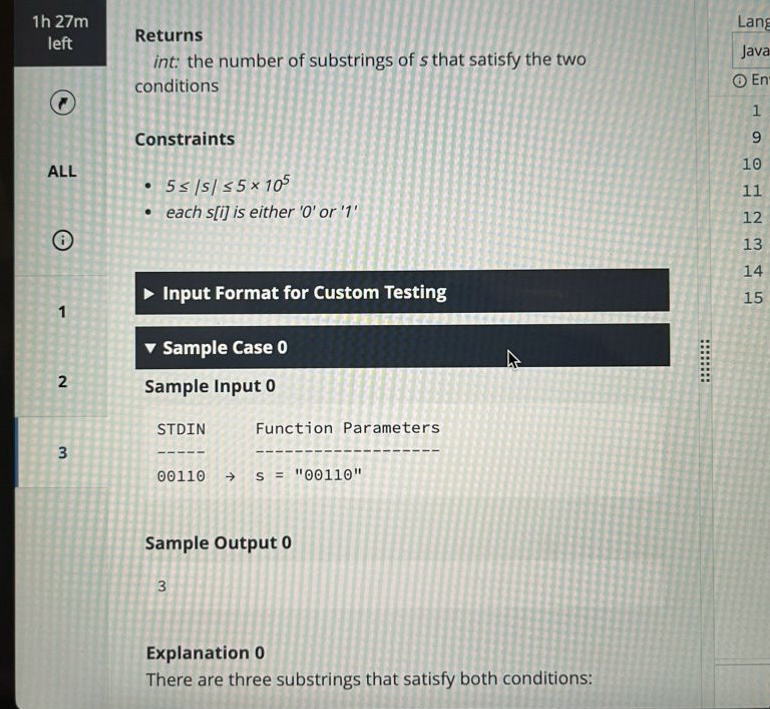 Then I reserved 5-8 mins for final reviews. I prioritized checking counting logic to avoid off-by-one errors and array or string traversal efficiency to ensure no redundant loops that would cause timeouts. For slightly more involved topics like segment-based string tasks, I avoided overcomplicating things back then. Sticking to intuitive, step-by-step solutions helped me save a lot of time during the OA, and I finished all questions with a few mins left for last-minute checks.