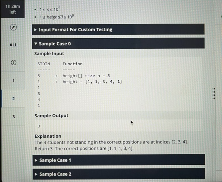 Then I compared the original array with the sorted array index by index. Whenever the values differed at the same position, it meant that the student at that position was standing incorrectly. In the sample case, three positions differ between the original and sorted arrays, so the answer is 3.