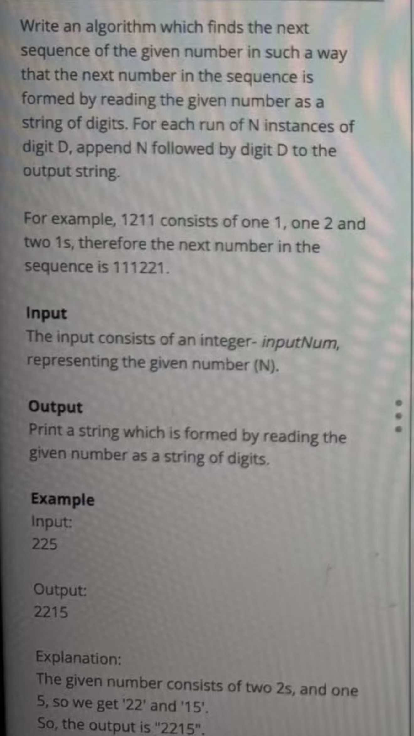 Description: Generate the next term in the look-and-say sequence by reading the input number as a string of digits and describing consecutive digit runs (e.g., "225" → "2215" for two 2s and one 5).