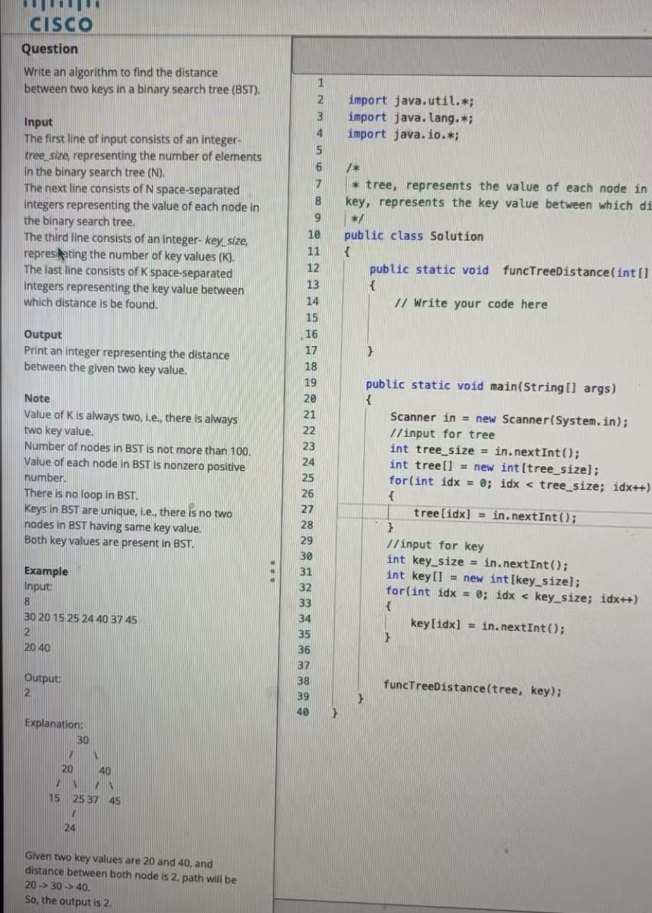 This problem required computing the distance between two nodes in a BST. My first thought was to find the Lowest Common Ancestor (LCA) of the two nodes, then calculate the distance from each node to the LCA and sum them. To find the LCA, I used the BST property: starting from the root, if both node values were smaller than the current node, I moved to the left subtree; if both were larger, I moved to the right subtree; otherwise, the current node was the LCA. To calculate the distance, I used a recursive function that traversed from a node to the LCA, counting the steps. I implemented this in Java, making sure to handle edge cases such as when one node was an ancestor of the other. The time complexity was O(H), where H is the height of the tree, and the space complexity was also O(H) due to the recursion stack.