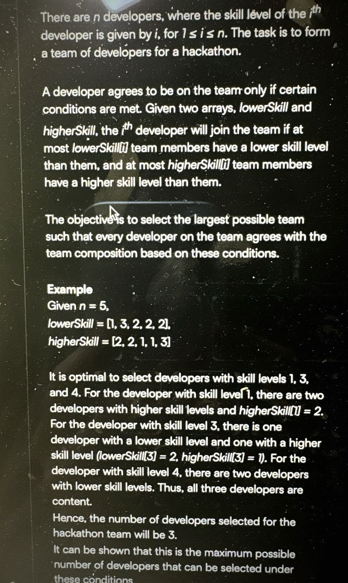 Dynamic Programming (DP) I defined DP[i]: the maximum team size that can be formed when the i-th developer (after sorting) is the person with the highest skill in the team. Recurrence Relation: DP[i] = 1 + max(DP[j] | j < i and Valid(j, i)) Constraint Check (Valid(j, i)): This is the most complex part. It ensures that after D_i is added to D_j's optimal team, the four constraints (L_i, H_i, L_j, H_j) of both D_j and D_i are still satisfied. For example: