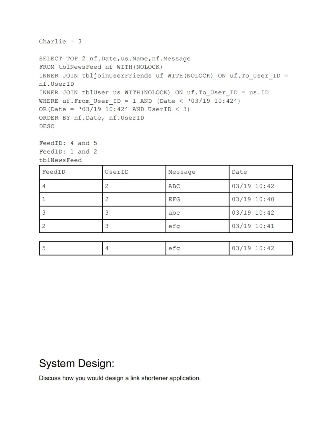 The prompt: Design Netflix. Two interviewers and one shadow. A few follow-ups: How would search work? How to provide examples for each type of movie to users? Pro tip: Practice with drawing tools ahead of time so you don't get flustered during the system design round.