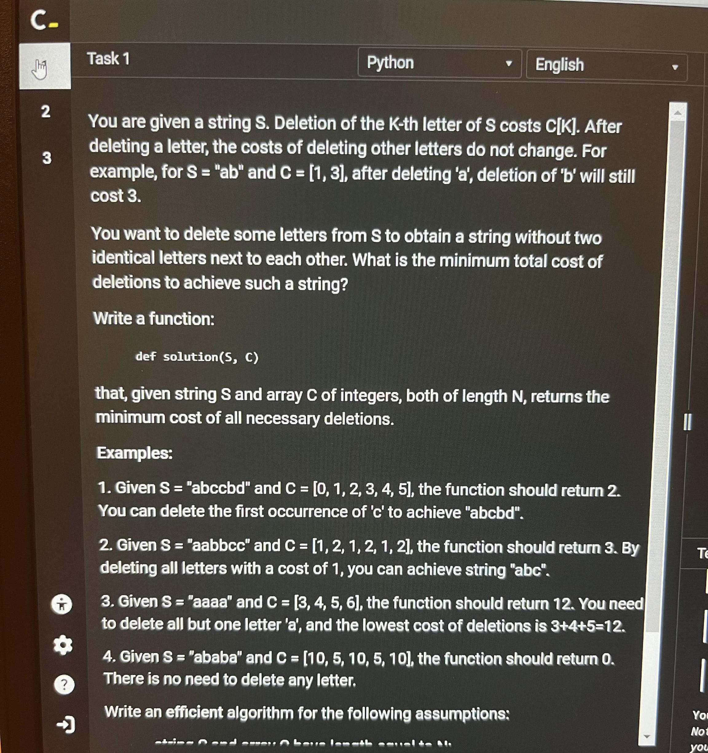 The core requirement was to remove adjacent duplicate characters from a string while minimizing the deletion cost. My approach therefore focused on handling groups of consecutive identical characters.