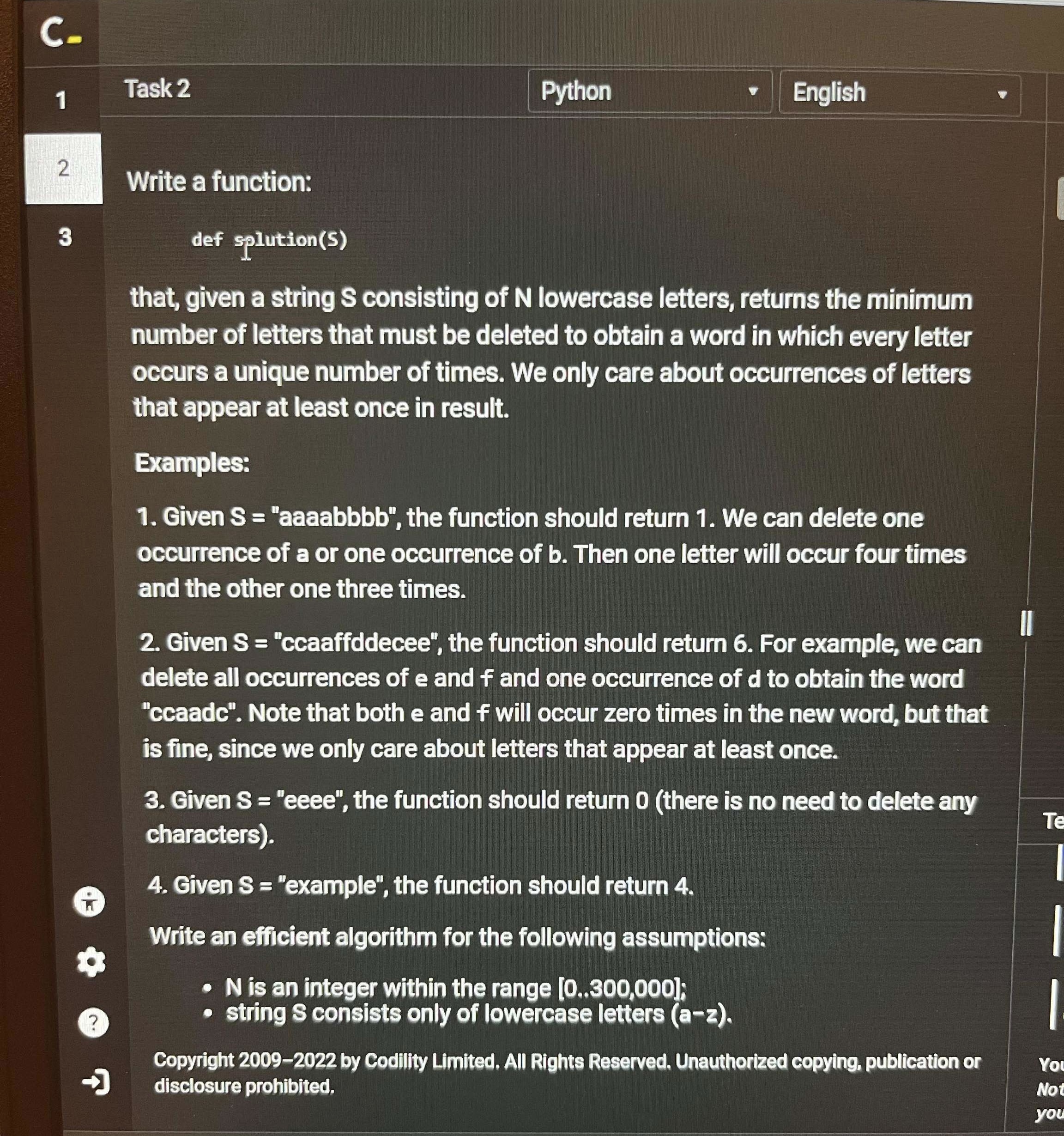I just interviewed for the HSBC Quant position. The coding part of the OA was done on Codility, with a total of three questions. The difficulty level was on the easier side of medium, and I had 60 minutes to complete them. Below, I’ll share the three questions I got and my thought process for solving each one.