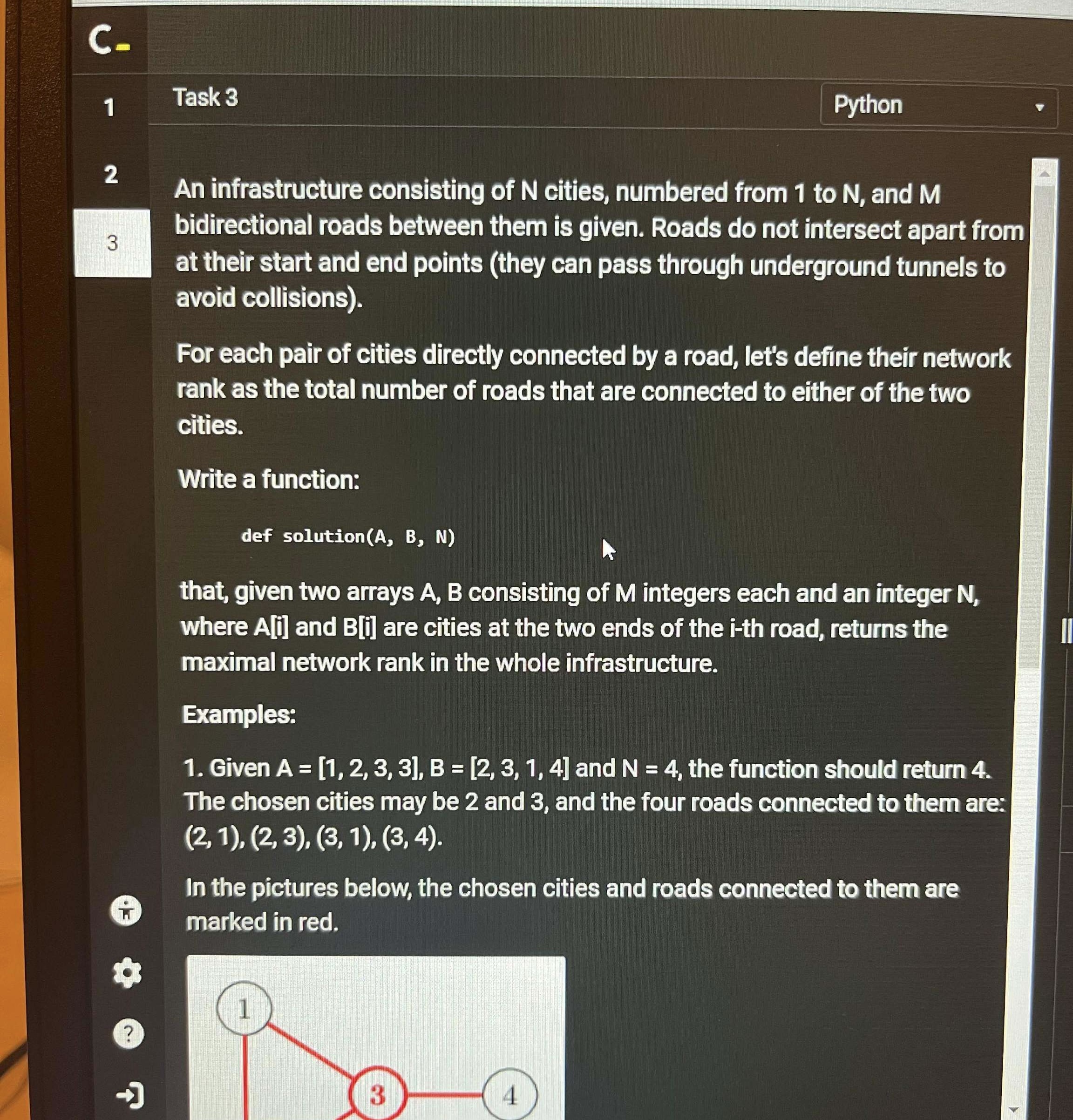 This one was about finding the maximum network rank. The definition was straightforward: the network rank between two directly connected cities was the sum of their individual road counts, minus one (to avoid double-counting the direct road between them).