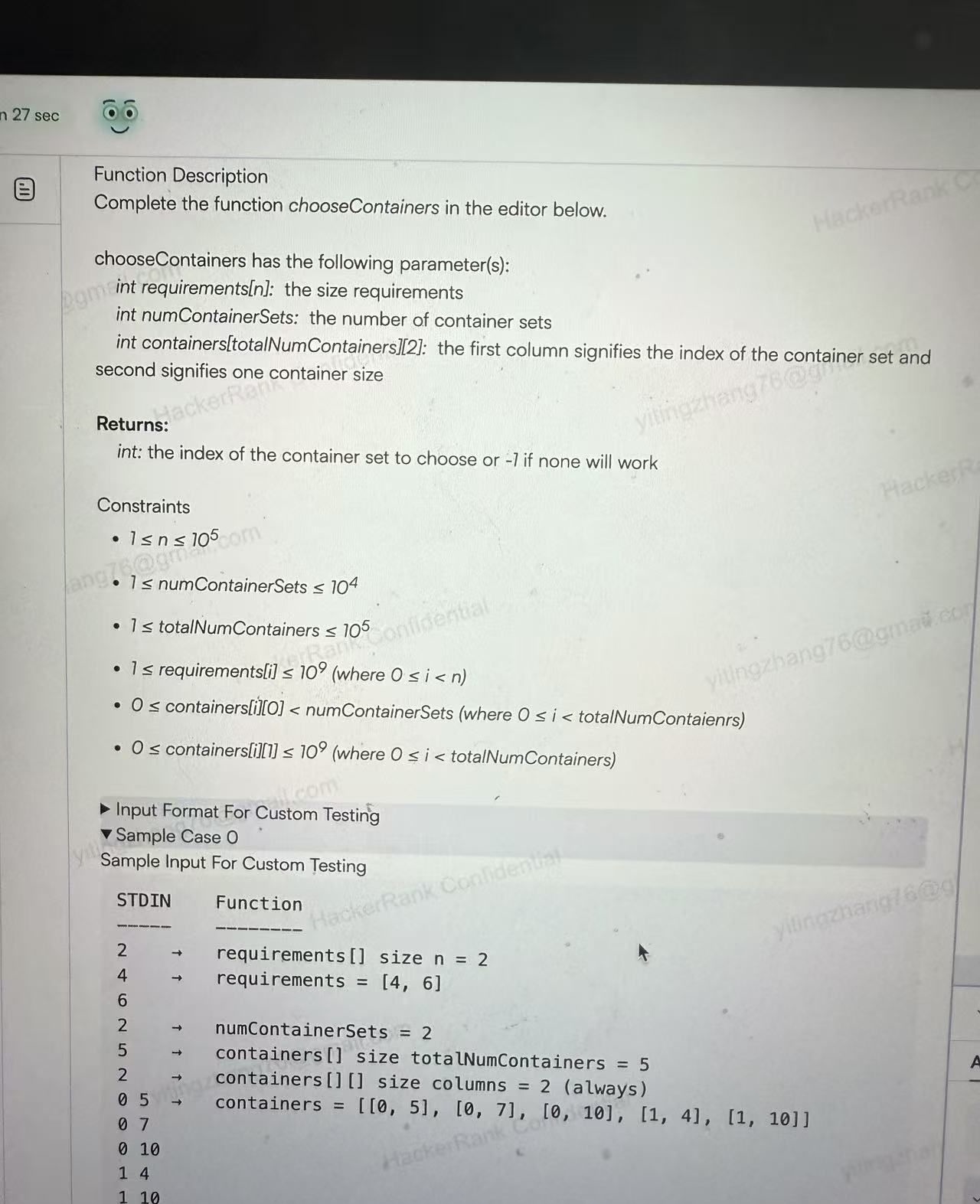 The IMC OA was conducted on the HackerRank platform. There were two coding questions with a total time limit of 120 minutes. Both questions were at the hard difficulty level, and no camera was required during the test.