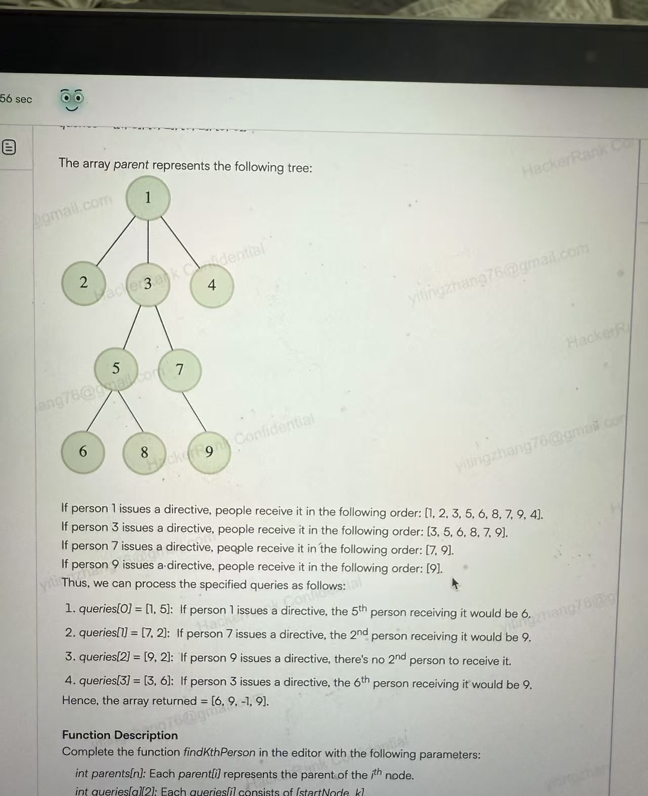 Construct a tree structure of "node-direct child nodes" based on the parent array, and sort the child nodes of each node in ascending order of indices. Use DFS to preprocess the total number of nodes in the subtree of each node and the subtree traversal sequence (traversed in the order of child nodes). When processing queries, first determine whether k exceeds the subtree size; if valid, directly retrieve the k-th node from the preprocessed sequence, otherwise return -1.