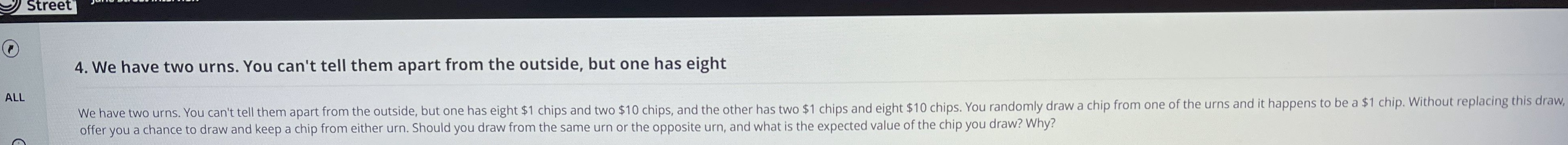 First, clarify the setup: there are two urns, X (mostly $1 chips) and Y (mostly $10 chips). The initial probability of having picked X or Y is 1/2. After drawing a $1 chip, we need to decide whether to “draw again from the current urn” or “switch to the other urn,” choosing whichever gives higher expected value.