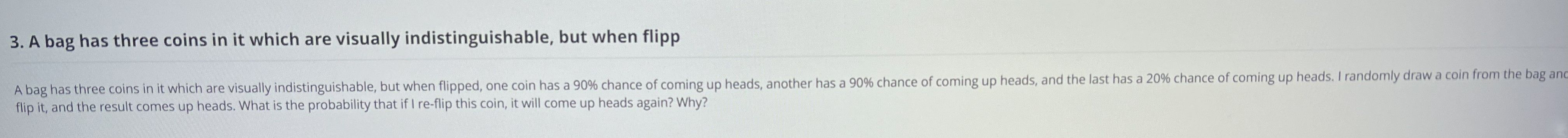 I first organized the given info: there are three coins, A and B land heads 90% of the time, and C lands heads 20% of the time. Initially, each coin is chosen with probability 1/3. Now the first toss is heads, and we want the probability that the next toss is also heads.