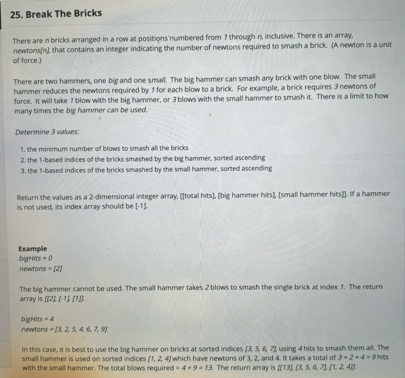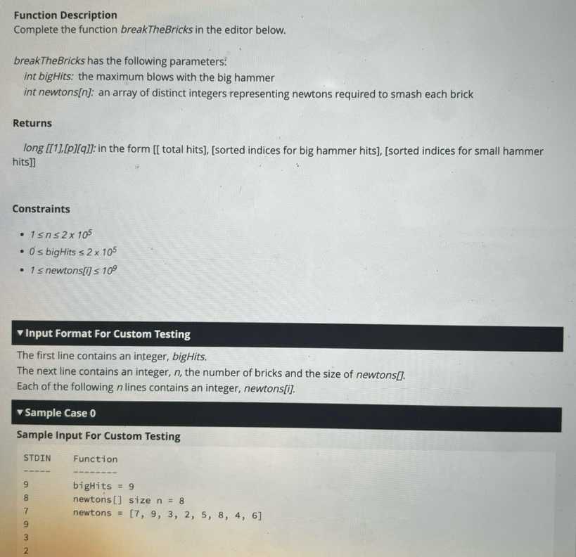 For this problem, the goal was to minimize the total number of hits needed to break all bricks. Each brick requires a certain amount of force k to break. A big hammer breaks a brick in one hit, while a small hammer requires k hits. So, the optimal strategy is to use the big hammer on the bricks with the highest newtons values, since replacing those saves the most total hits.