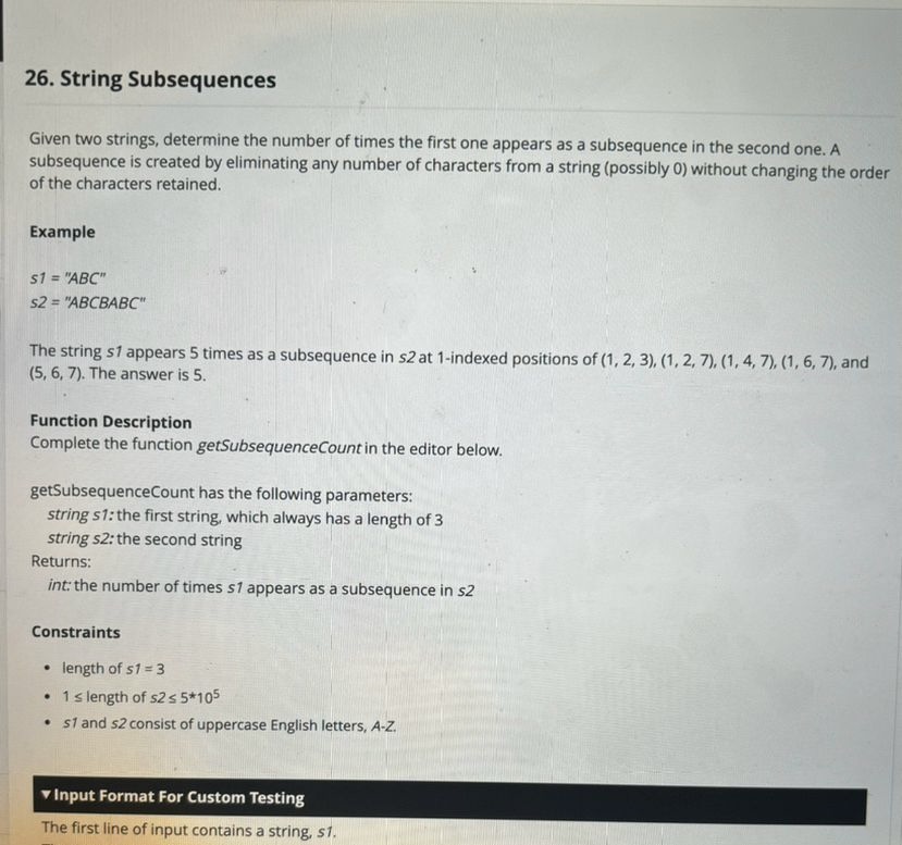 The task was to find how many times s1 appears as a subsequence within s2, given that the length of s1 is fixed at 3. I recalled the dynamic programming approach for counting subsequences.
