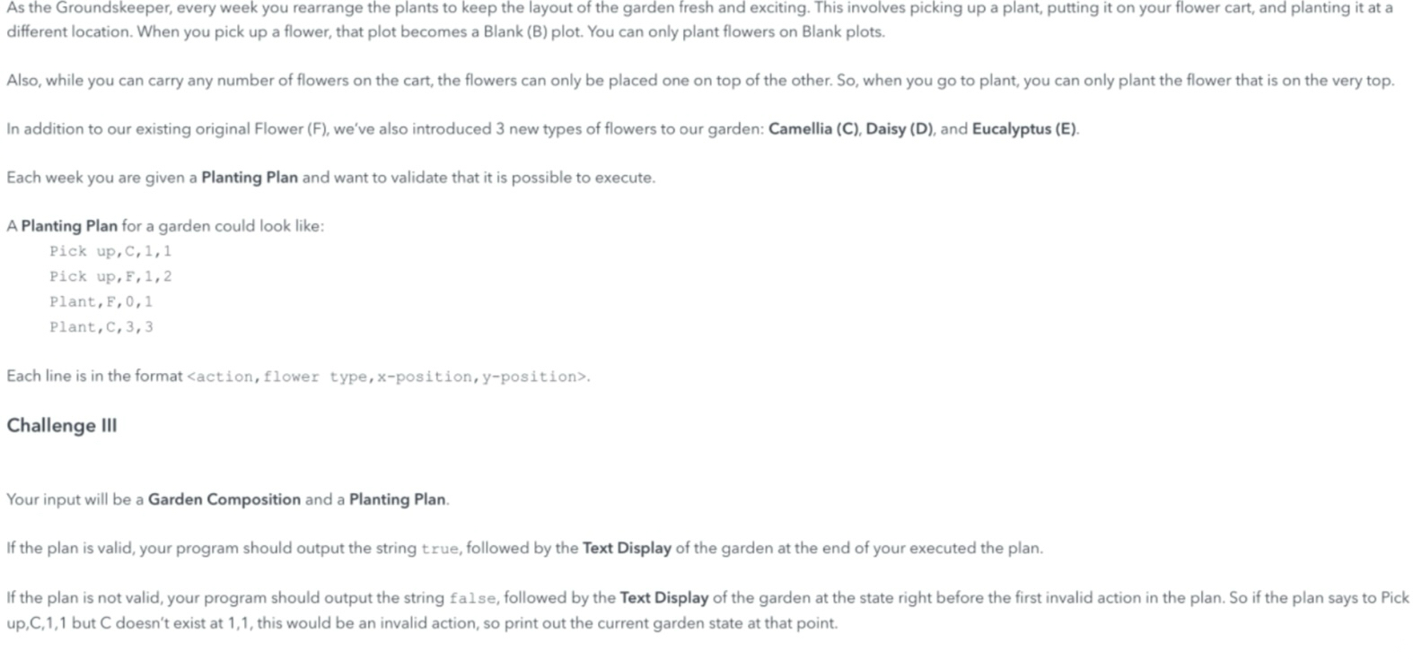 This challenge involved validating the correctness of garden operations and managing a stack for flower carts. The key rules were: