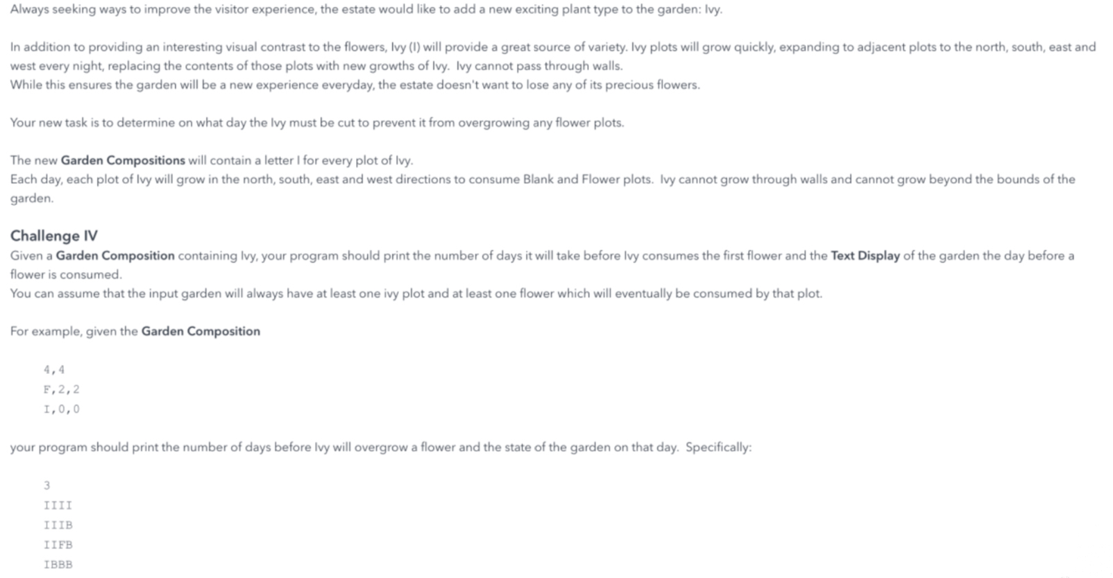 This one dealt with the growth of ivy, which spreads in four directions each day until it reaches a flower, wall, or boundary. The task was to determine the first day when it touched a flower and output the garden state from the previous day.