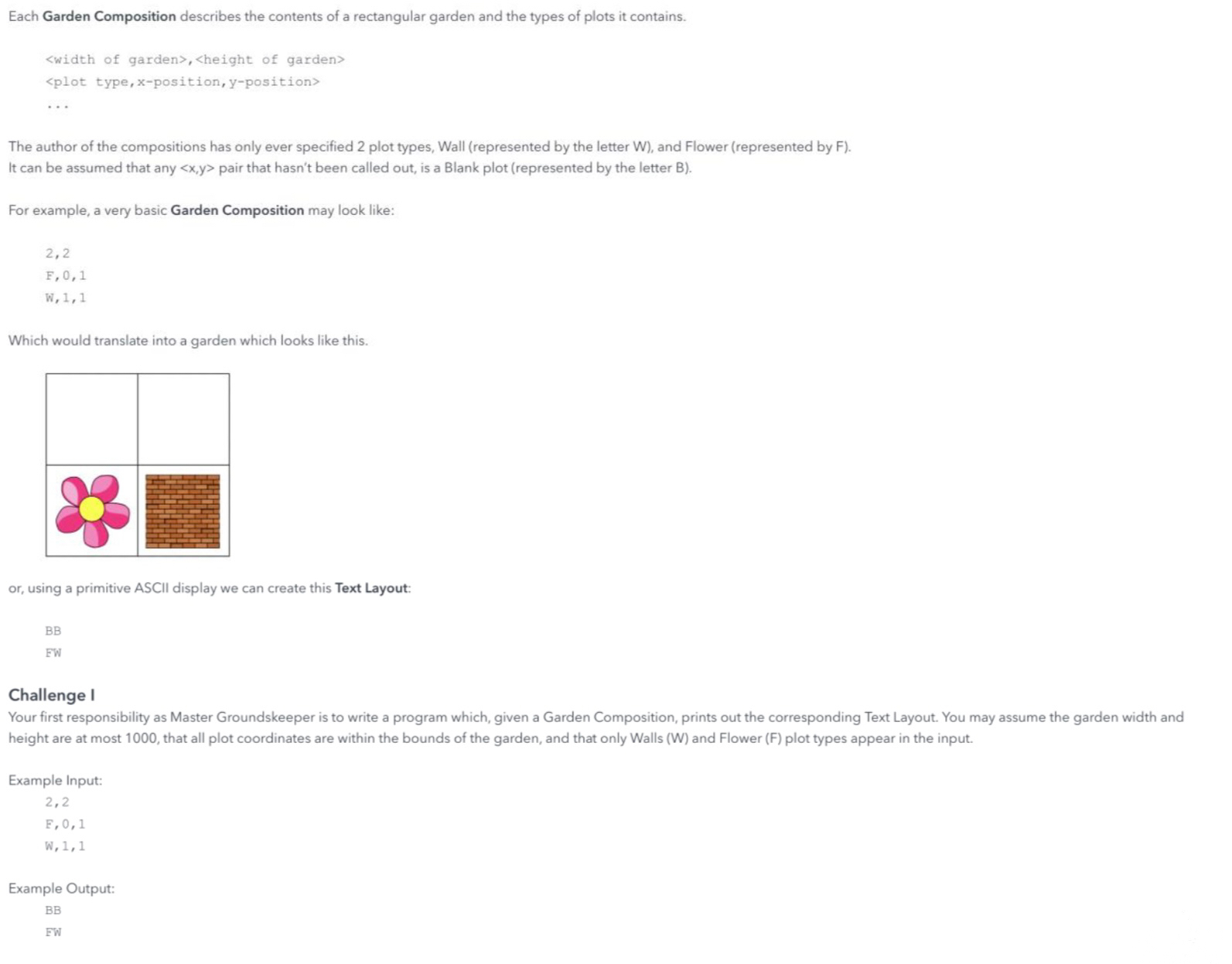 The first step was to represent the garden structure using an appropriate data structure. I started by reading the width and height, then initialized a 2D array where every position was set to 'B' by default. After that, I processed each plot type and updated the corresponding positions to 'F' or 'W' as needed. Finally, I printed the 2D array row by row as the output.