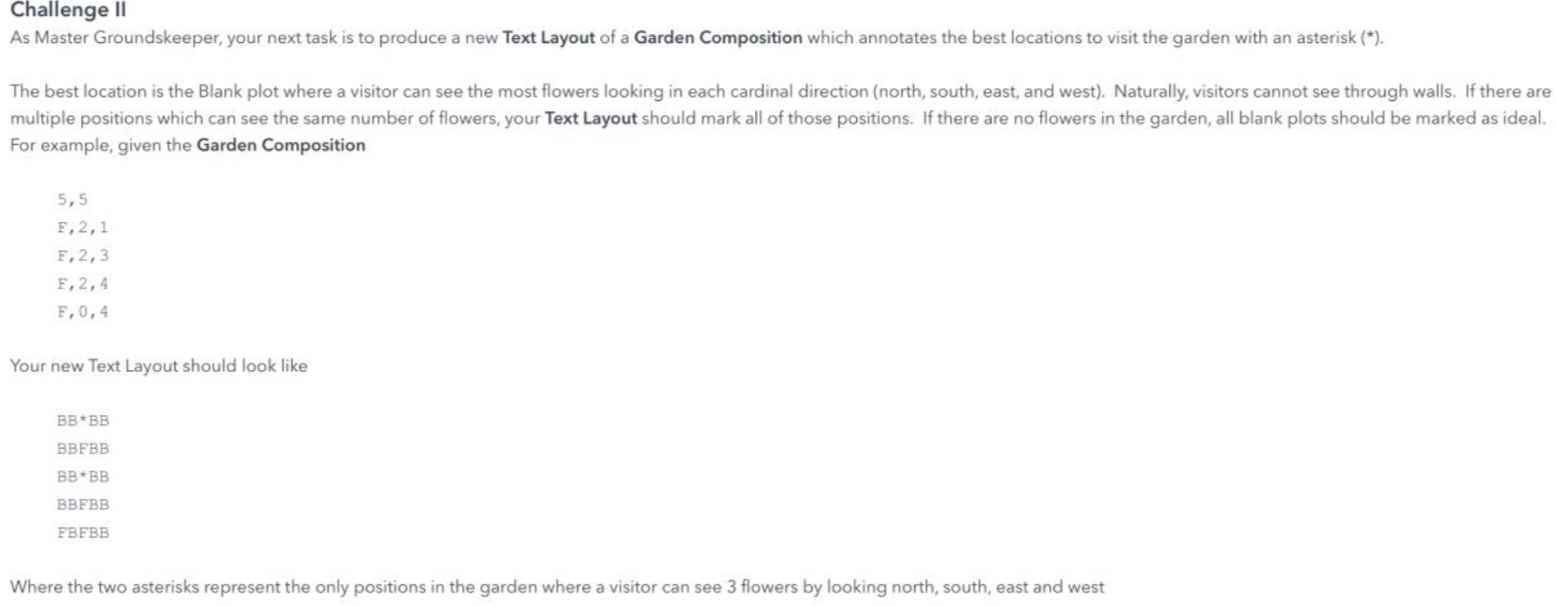 This one was more interesting. The goal was to find, for every blank plot, how many flowers were visible in the four directions, and then mark all positions with the highest count as '*'.