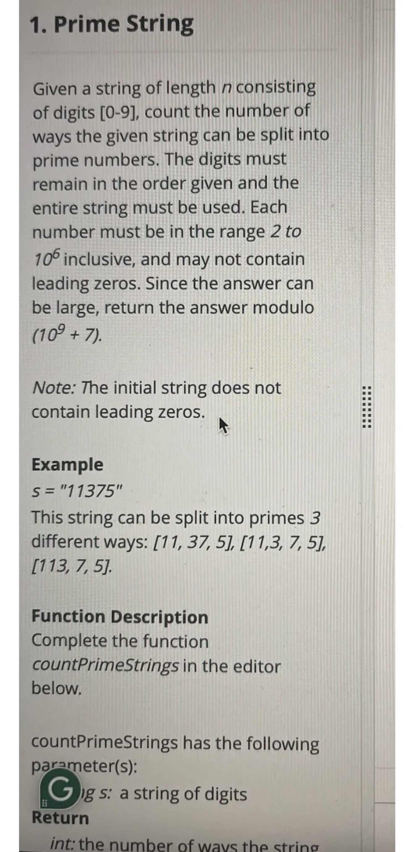 Snowflake's HackerRank OA focuses heavily on algorithms and data structures, with dynamic programming (DP), string manipulation, and mathematical logic being dominant. For example, problems like "Prime String" require sieve-based prime checks combined with DP to count valid splits. Another type, like "Text Scoring", emphasizes string matching for prefix and suffix overlaps. Topics such as graph traversal (BFS/DFS) and efficient data structure usage (heaps, treemaps) also appear frequently, as seen in problems involving optimal transformations or interval management.