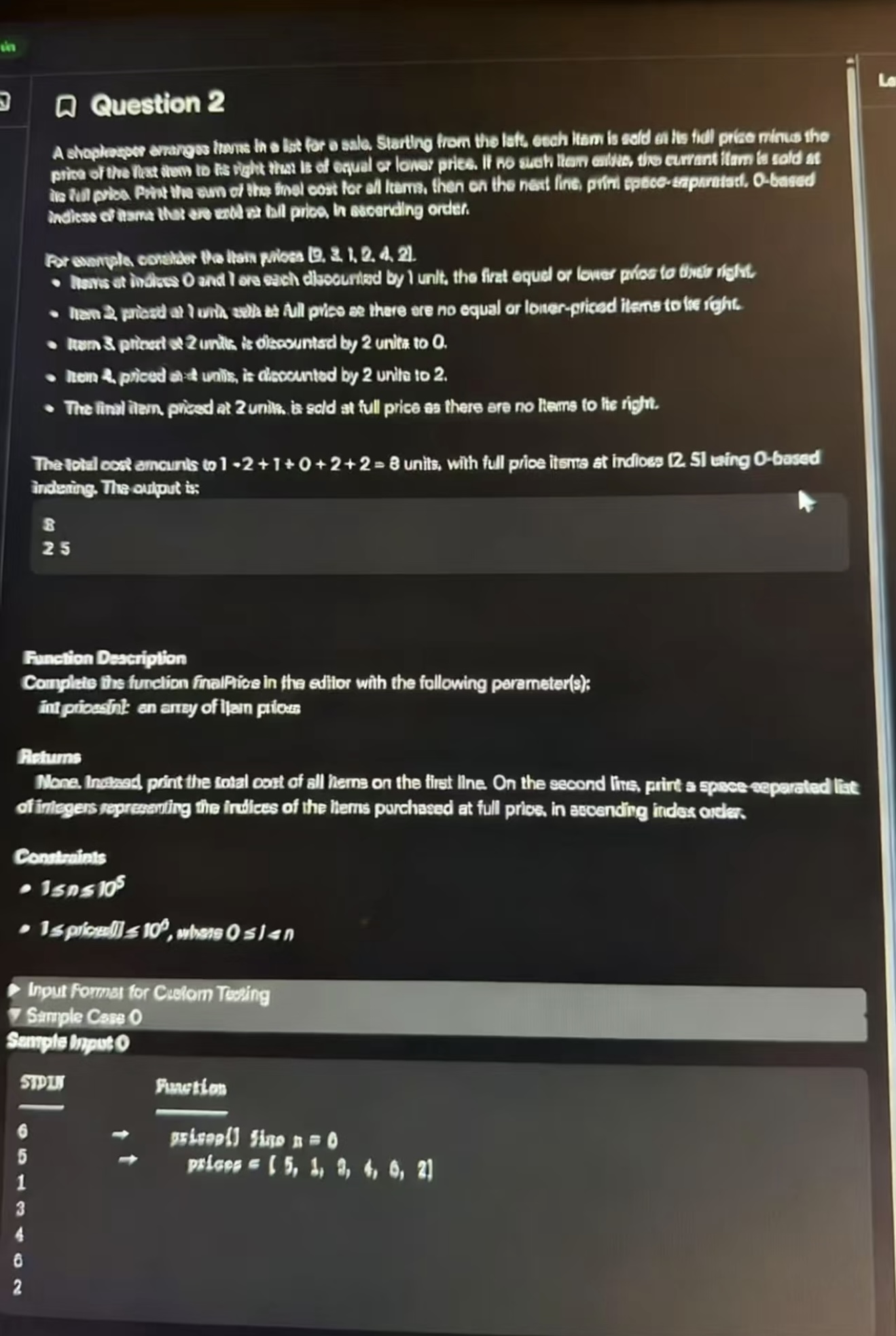 At first, I considered a simple brute-force approach (for each item, scan to the right for the first price that is less than or equal to it). But with n as large as 1e5, that would time out, so a monotonic stack was necessary.